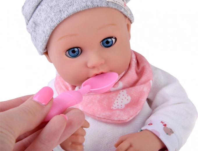 Bambola bebè 32 cm con palpebre mobili e set per la pappa
