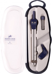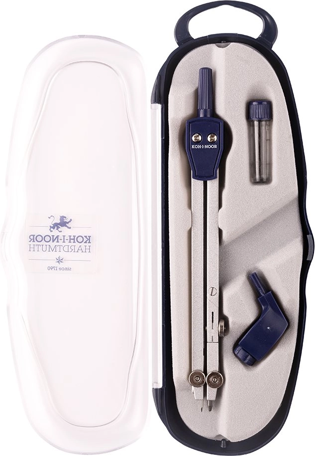 Pratico compasso scolastico del marchio KOH-I-NOOR per tracciare cerchi con precisione fino a un diametro di 360 mm. Include un adattatore universale, una portamine con 2 mine di ricambio e una robusta scatolina in plastica per una conservazione sicura.