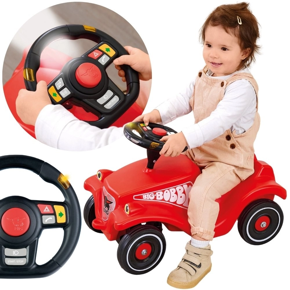Il volante multifunzione BIG trasforma ogni corsa sul cavalcabile in una vera avventura. I bambini apprezzeranno le frecce con luci LED, il clacson, il suono di avviamento, la radio e altri effetti realistici. Grazie al design resistente all’acqua è ideale anche per giocare all’aperto.