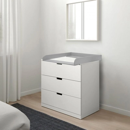 Pratico rialzo fasciatoio in legno dal raffinato colore grigio per un cambio pannolino sicuro e confortevole. Offre montaggio e smontaggio facili, pannello frontale scorrevole fino a 4 cm e compatibilità con le cassettiere IKEA (Nordli, Malm, Hemnes). La soluzione ideale per risparmiare spazio e organizzare con intelligenza la cameretta.
