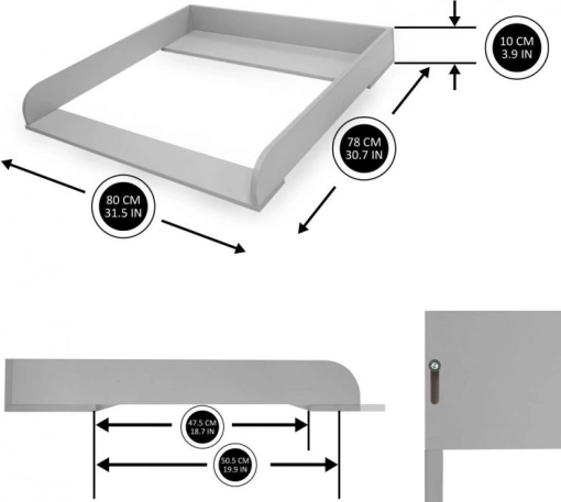 Il montaggio e lo smontaggio richiedono pochi istanti, così puoi rimuovere il fasciatoio in qualsiasi momento e tornare a usare la cassettiera normalmente. Le dimensioni studiate di 80 × 78 × 10 cm si adattano ai modelli selezionati di cassettiere IKEA e offrono spazio sufficiente per il materassino fasciatoio e gli accessori indispensabili.