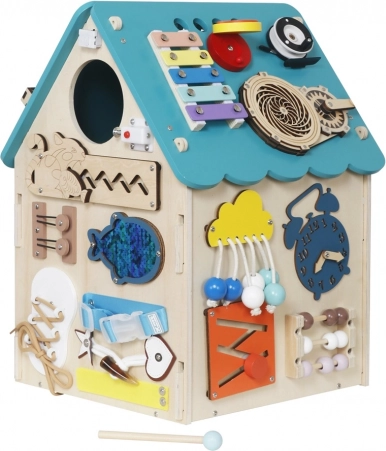 Casetta Montessori turchese 2Kids Toys con molte attività: serrature, labirinto, xilofono, orologio e altro. Sviluppa motricità fine, logica e autonomia. 3+.
