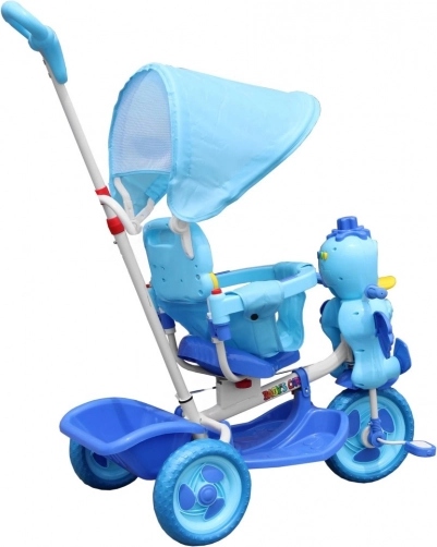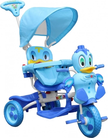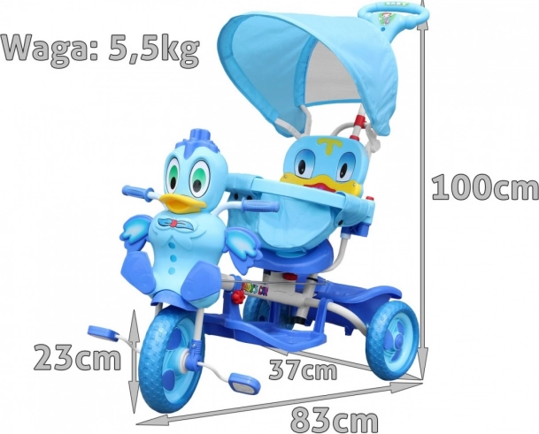 triciclo per bambini anatra blu con suoni, cappottina, barriera di sicurezza e cestino portaoggetti