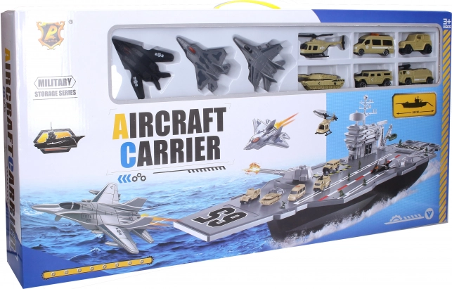 Grande portaerei con ricchi accessori per un gioco d’azione. Include 5 veicoli con ruote libere, elicottero, 3 caccia, motoscafo e mini figure di soldati. Ideale per bambini che amano scenari militari e aeronautici. Dimensioni della nave 86 × 19 × 21 cm. È incluso un manuale illustrato per il montaggio e l’uso.
