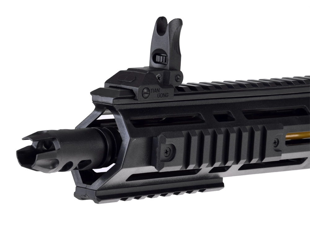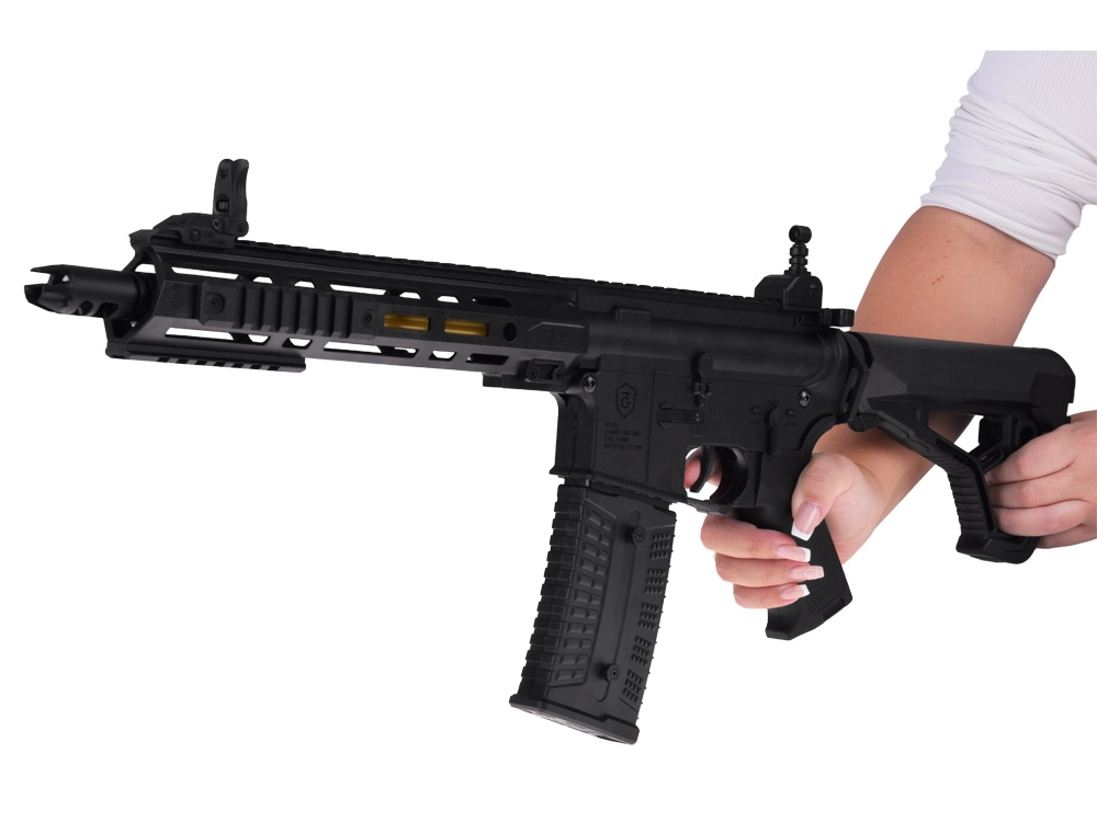 Il lungo astina anteriore con slitte di montaggio, le mire ribaltabili e il calcio regolabile intensificano l’esperienza di gioco e migliorano l’ergonomia dell’impugnatura.