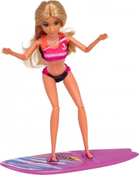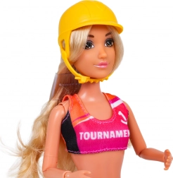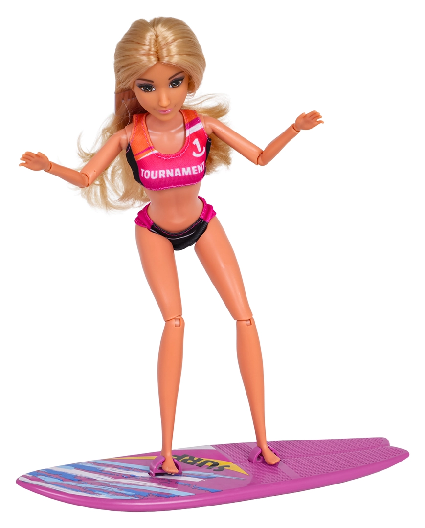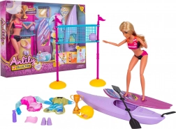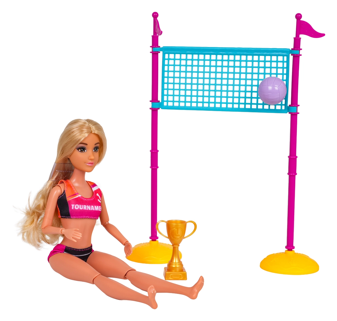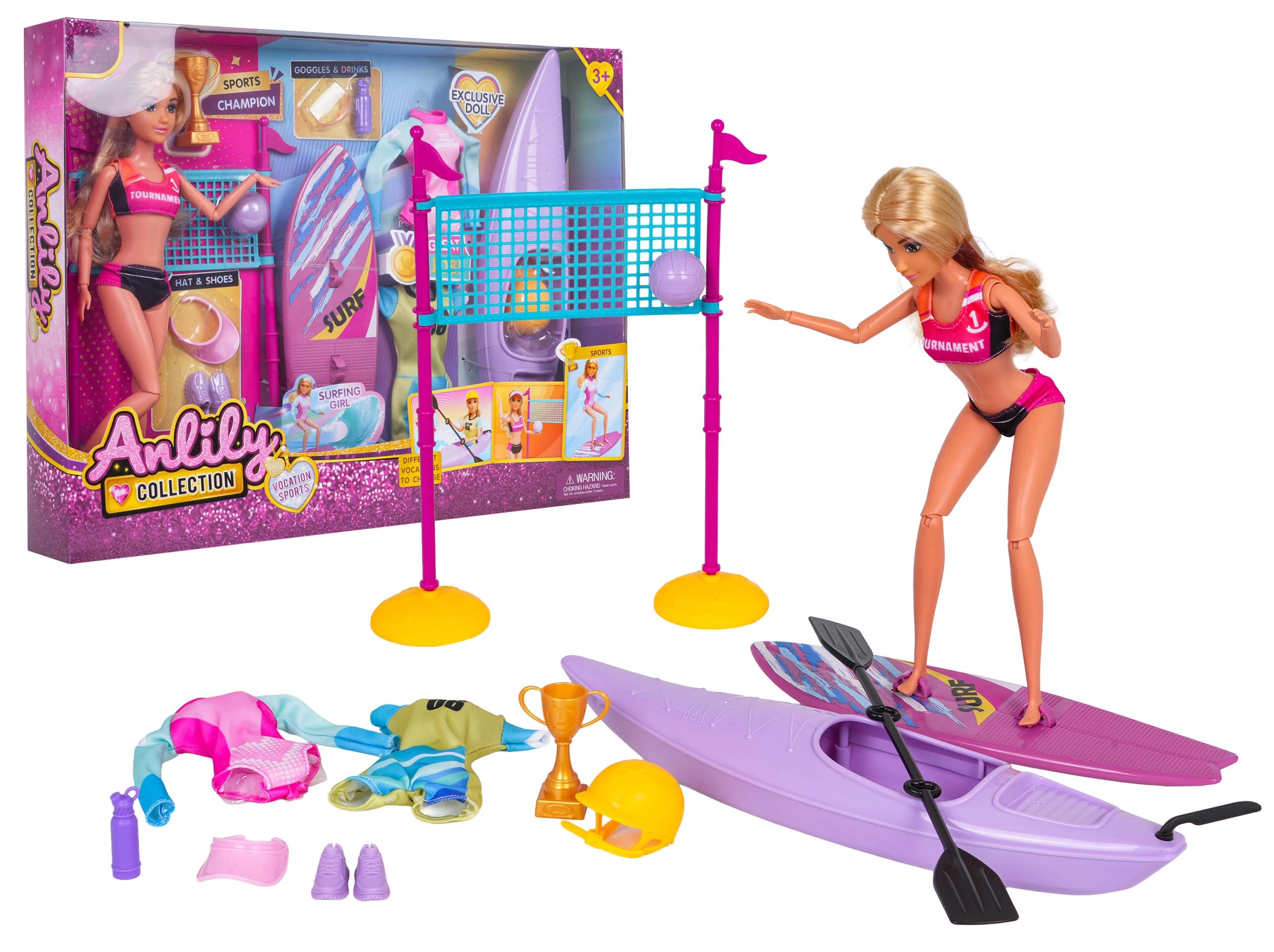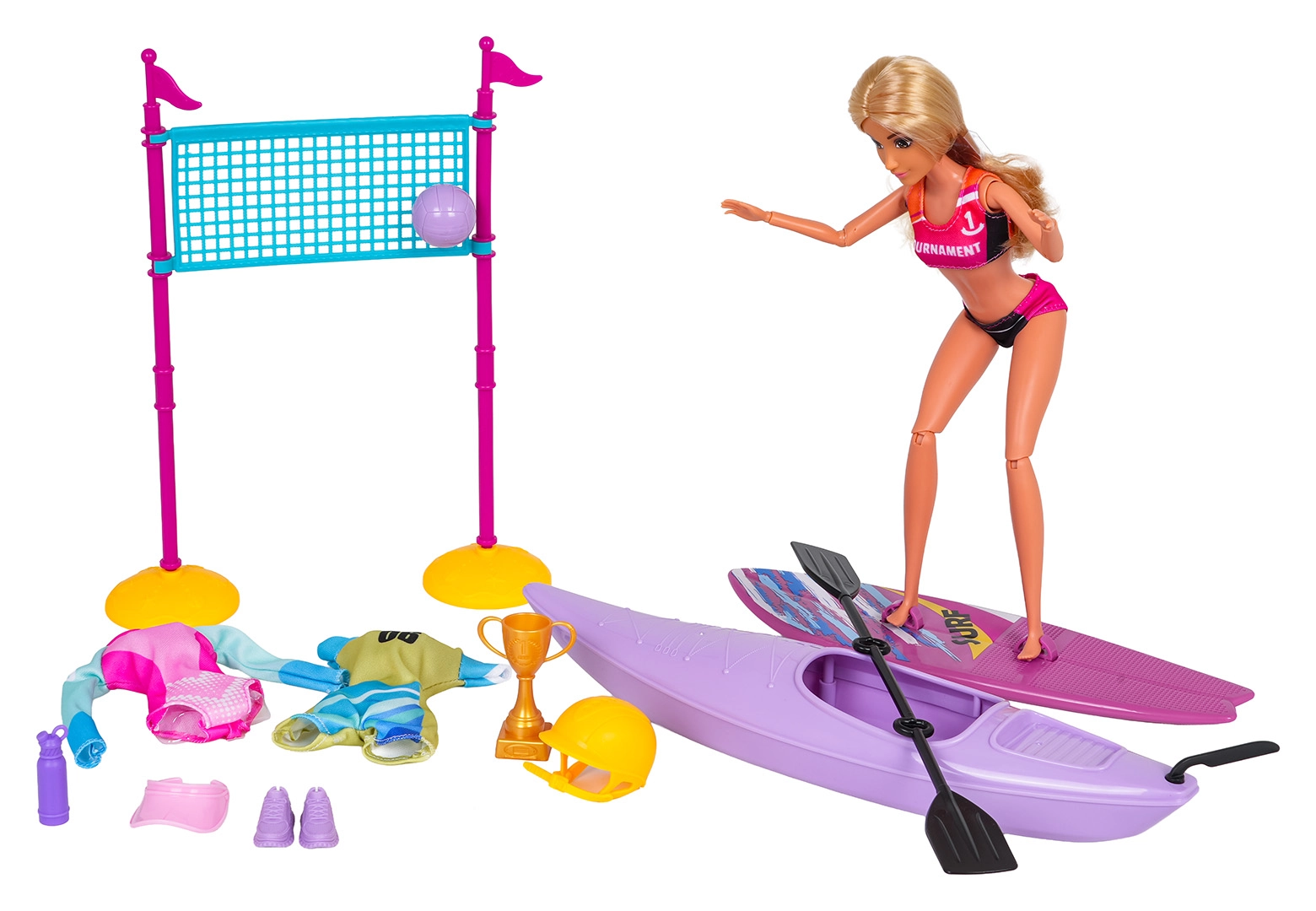 - bambola con outfit da pallavolo, rete da pallavolo, pallone, cappellino con visiera, scarpe sportive, trofeo/medaglia, occhiali, borraccia, tavola da surf/paddle, kayak, casco, pagaia, altri 2 outfit sportivi