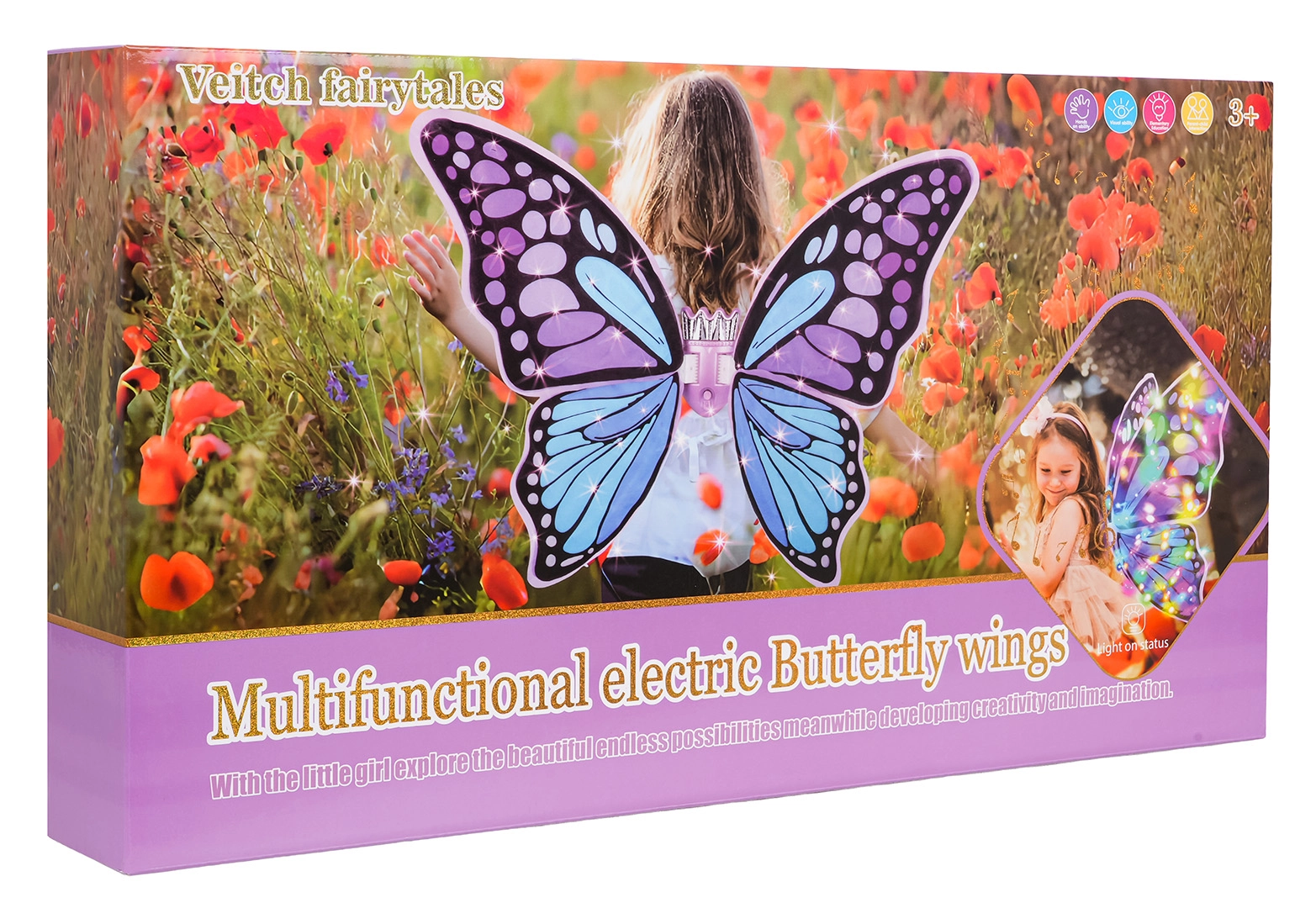 Trasforma il gioco quotidiano in un'avventura fiabesca con queste ali da farfalla viola per bambini dai 3 anni. Offrono effetti luminosi, suoni/melodie e diversi modi di gioco con battito d'ali. Grazie alle bretelle regolabili sono comode da indossare e perfette per carnevale, spettacoli e giochi di fantasia.