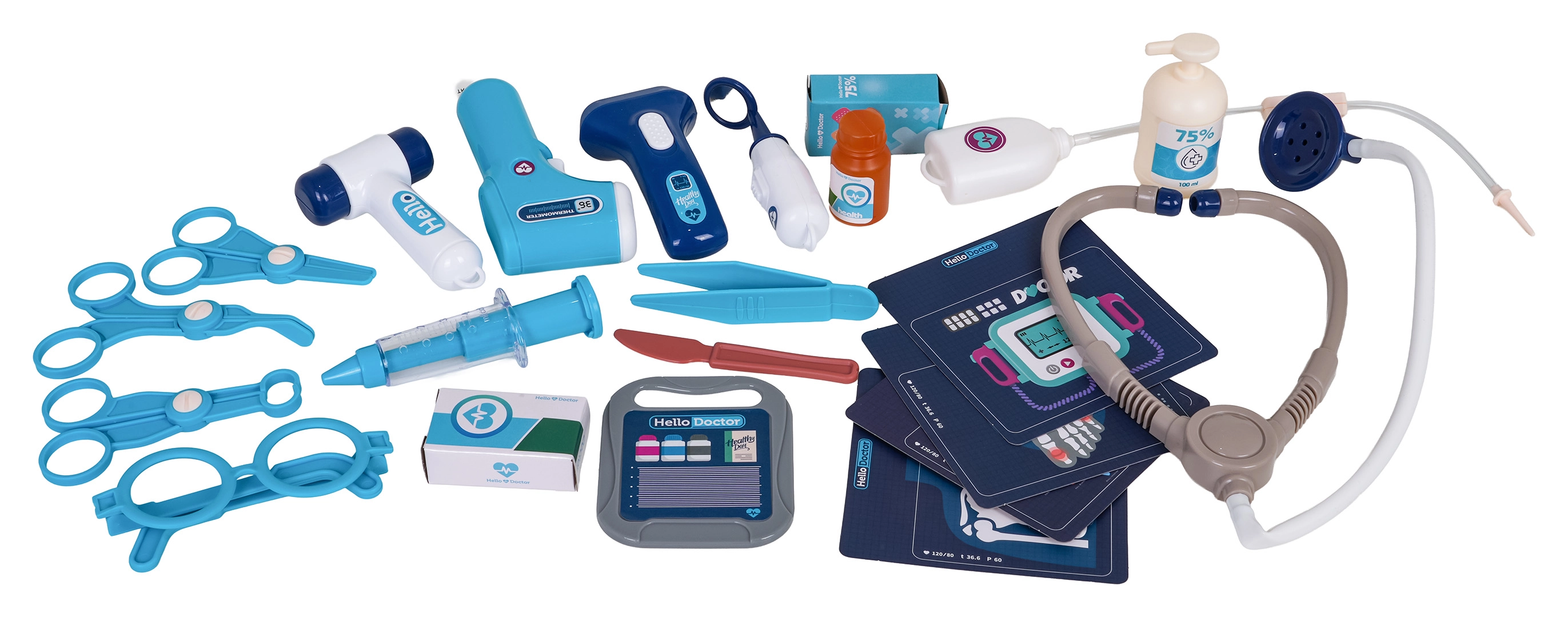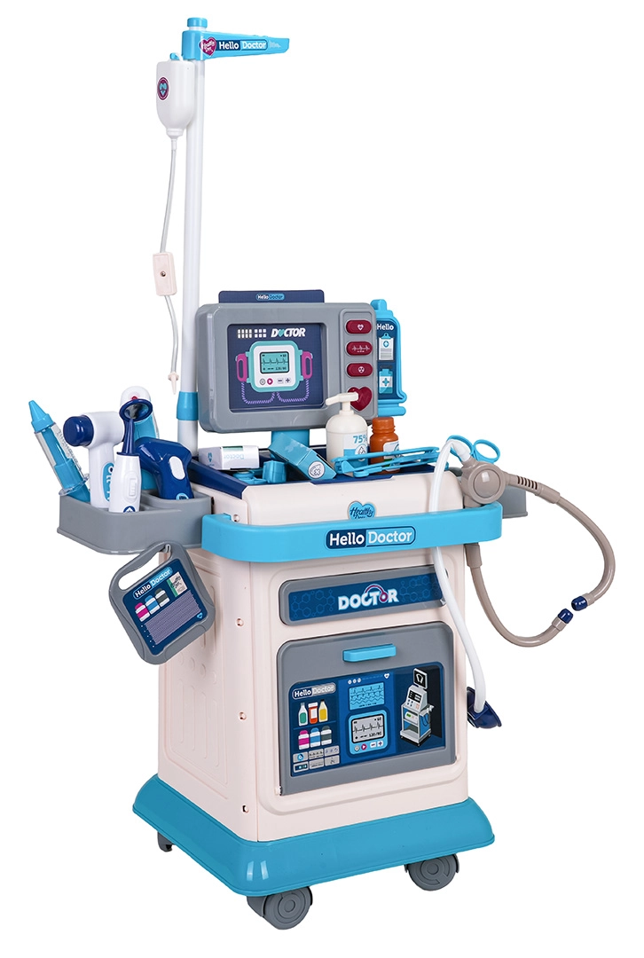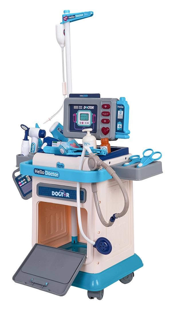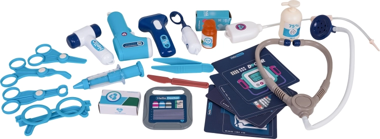 Nella confezione i bambini troveranno tutto il necessario: stetoscopio, termometro senza contatto con luce, siringa, forbici, pinzetta, specchietto, martelletto neurologico, occhiali e piccoli accessori come scheda paziente, boccetta con “disinfettante”, scatolina con cerotti e medicinali e supporto per flebo (IV). Il carrello ha un pratico cassetto e supporti per organizzare gli strumenti in modo ordinato.
