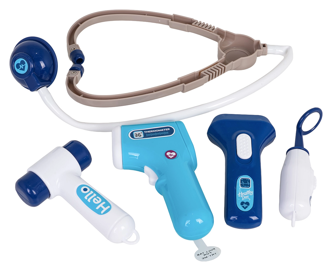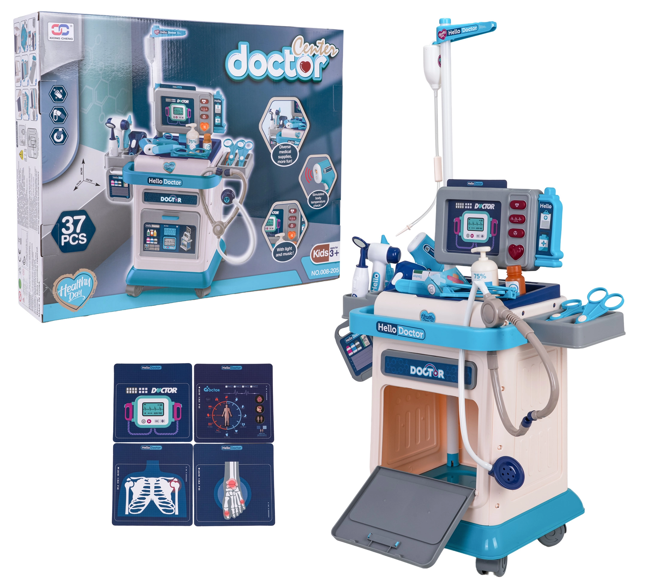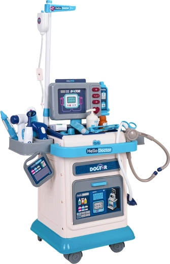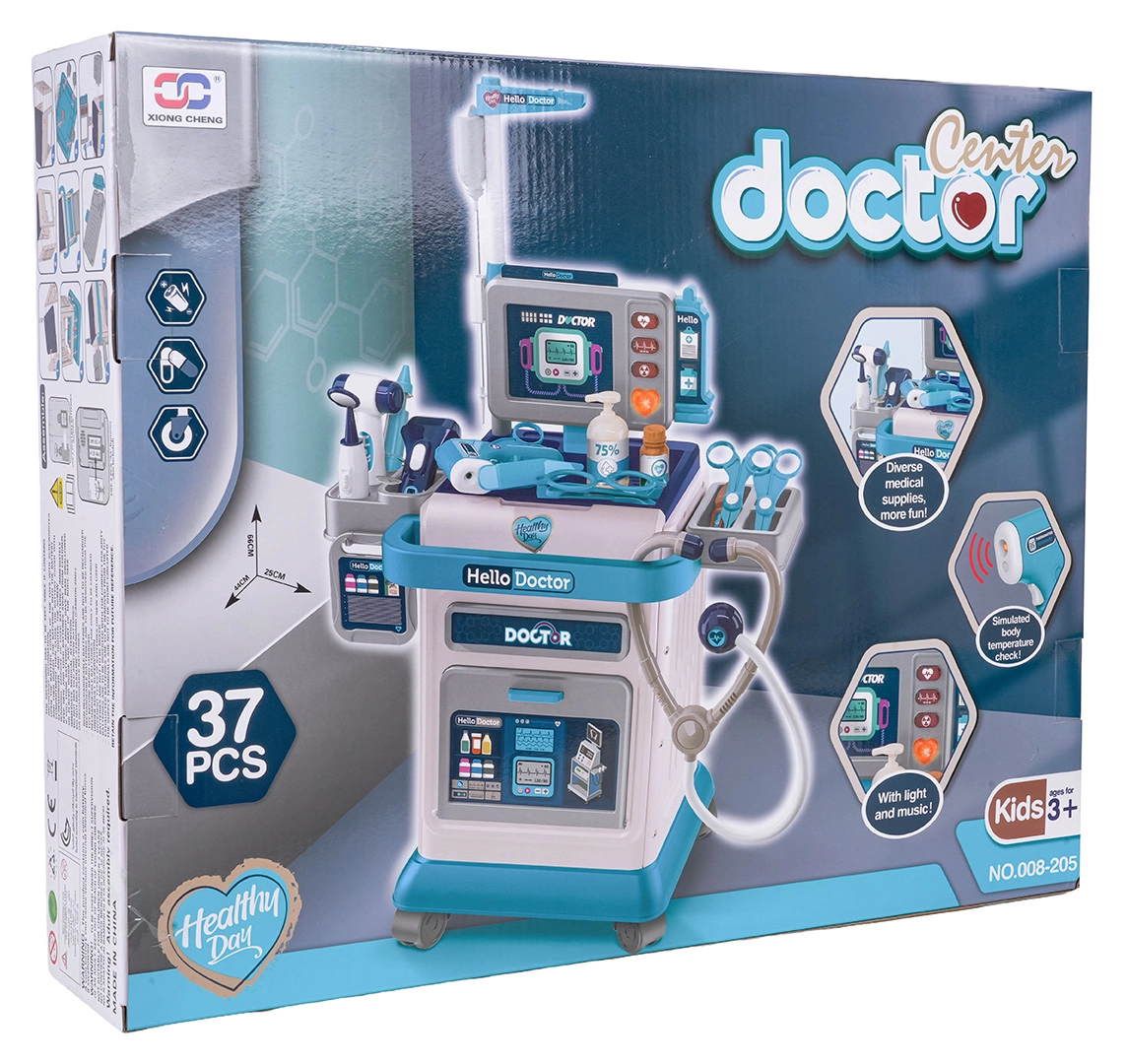 Nella confezione i bambini troveranno tutto il necessario: stetoscopio, termometro senza contatto con luce, siringa, forbici, pinzetta, specchietto, martelletto neurologico, occhiali e piccoli accessori come scheda paziente, boccetta con “disinfettante”, scatolina con cerotti e medicinali e supporto per flebo (IV). Il carrello ha un pratico cassetto e supporti per organizzare gli strumenti in modo ordinato.