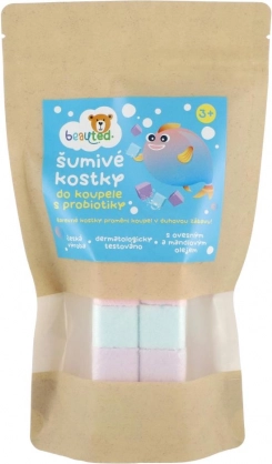 Cubetti frizzanti da bagno con probiotici per bambini. Cura delicata, sale marino, avena e olio di mandorle. Dermatologicamente testati, prodotto ceco in sacchetto richiudibile.