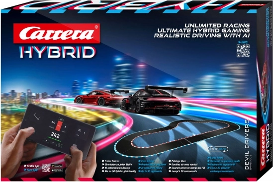 Il set Carrera Hybrid Devil Drivers offre la combinazione perfetta tra gioco e corsa. Grazie al supporto dell'intelligenza artificiale puoi impostare il comportamento di ogni auto e provare diversi livelli di difficoltà, modalità carriera e gara. L'app Carrera Hybrid, con cockpit ispirato alle vere auto da corsa, permette un controllo intuitivo, gare online e lo sblocco progressivo di nuove sfide.