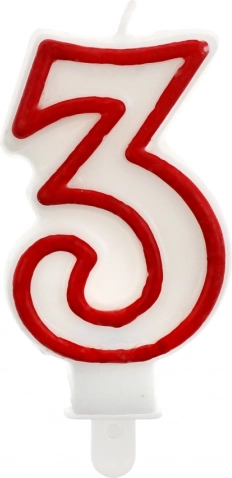 Elegante candela per torta numero 3 di colore bianco con bordo rosso a contrasto, perfetta per donare un tocco festoso a ogni celebrazione. Con un'altezza di 7 cm è ben visibile e, grazie al pratico supporto, si posiziona facilmente e in modo stabile sulla torta.