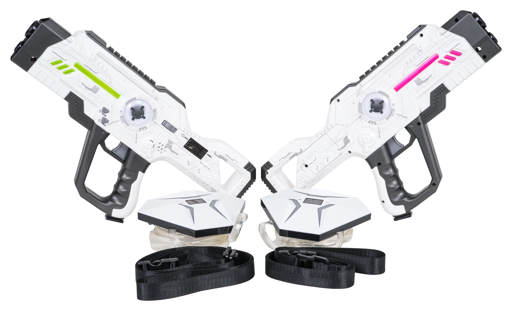 Questo set completo di laser tag offre divertimento d'azione per tutta la famiglia. Due blaster laser e due gilet luminosi con cinghie regolabili permettono una preparazione rapida e una competizione leale. Grazie ai chiari display LED su pistole e gilet, vedi continuamente vite e proiettili rimanenti e, prima dell'inizio, imposti la difficoltà: vite 1–99 e munizioni 1–12.