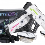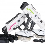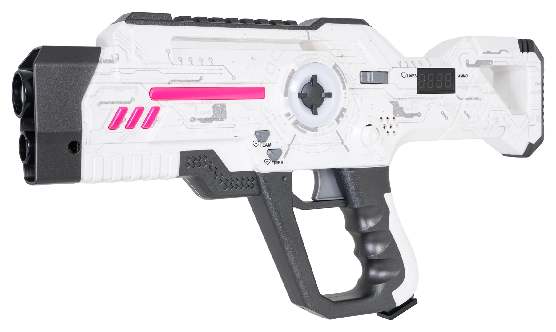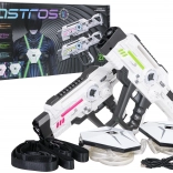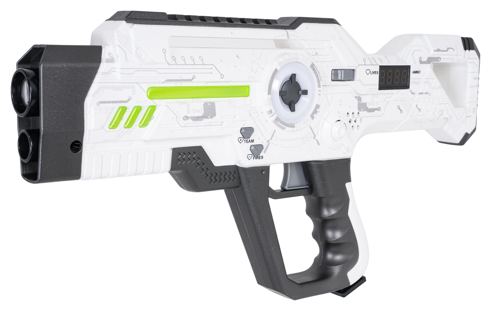 Scegli il colore della squadra (arancione, blu, rosso, verde) e passa tra le modalità: tiratore singolo, fucile laser, mitra e fucile al plasma. Le cinghie illuminate migliorano la visibilità al crepuscolo e i comandi vocali mantengono il ritmo della partita. La portata di tiro è fino a 60 m al buio. Incluso cavo di ricarica USB con quattro connettori per ricaricare comodamente tutti i dispositivi contemporaneamente.