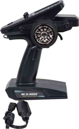 Contenuto della confezione: trasmettitore 2,4 GHz, batteria 7,4 V (inclusa), cavo di ricarica USB, ruota di scorta, set di chiavi e clip carrozzeria, manuale. Il trasmettitore è alimentato da 3× AA 1,5 V.