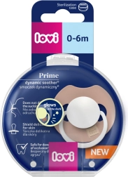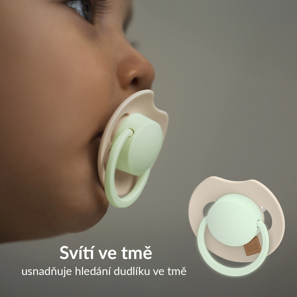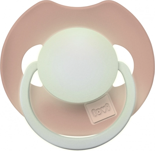 Il centro e il manico del ciuccio LOVI Prime brillano al buio, così puoi trovarlo rapidamente senza accendere la luce e senza disturbare il sonno del bambino.