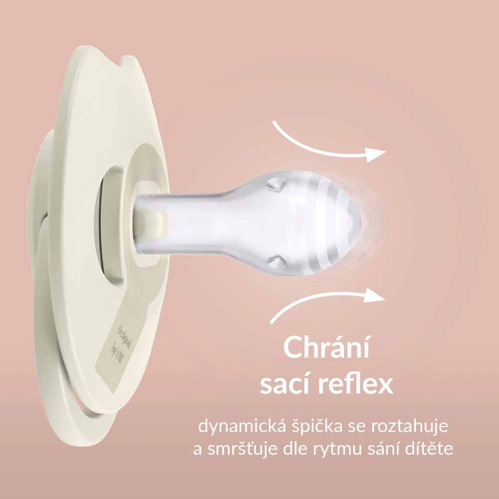 Il ciuccio LOVI Prime è stato sviluppato in collaborazione con specialisti per rispettare le esigenze naturali dei neonati. La succhietto dinamico in silicone di diverso spessore si espande e si contrae secondo il ritmo di suzione, protegge il riflesso di suzione e non interferisce con l’allattamento. La punta simmetrica si ispira alla forma del capezzolo riempito di latte, offrendo al bambino una sensazione familiare e calmante.