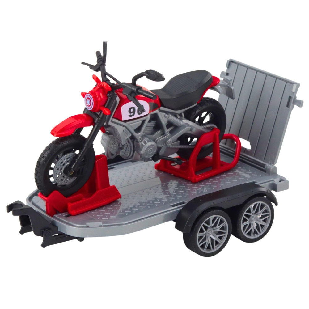 Il rimorchio a due assi con rampa funzionante facilita il carico della moto e amplia le possibilità di gioco e trasporto.