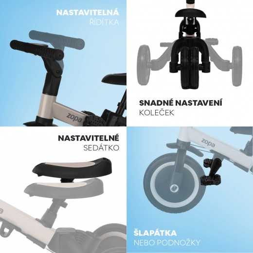ZOPA Razor Pro 6in1 è un triciclo multifunzione che cresce con il tuo bambino. Grazie alla struttura modulare intelligente si trasforma facilmente da triciclo con cappottina e asta di guida a guida autonoma con pedali, balance bike o “bicicletta”. L’attenzione a sicurezza e comfort è garantita da cinture a 5 punti, barra di protezione, poggiatesta e cappottina extra lunga contro il sole.