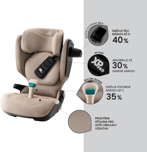Il pacchetto sicurezza comprende XP-PAD per proteggere collo e torace in caso di urto frontale, SecureGuard per l’ottimale posizione della cintura addominale e SICT di nuova generazione per assorbire l’energia in caso di impatto laterale. I connettori ISOFIX integrati facilitano un’installazione rapida e stabile; in alternativa è possibile fissare il seggiolino anche solo con la cintura di sicurezza a 3 punti del veicolo.