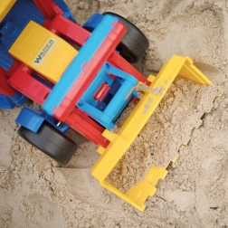 Grande trattore in plastica con benna anteriore funzionante per raccogliere, travasare e spingere la sabbia. Struttura resistente in plastica sicura, ideale per giardino, parco giochi e casa. Lunghezza 60 cm, la benna facilmente manovrabile favorisce motricità e gioco creativo.