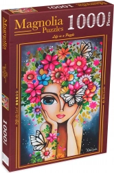 Elegante puzzle con motivo di una ragazza circondata da fiori per momenti di calma e relax. Contiene 1000 pezzi e, una volta completato, misura 48 × 68 cm – ideale per incorniciare ed esporre.