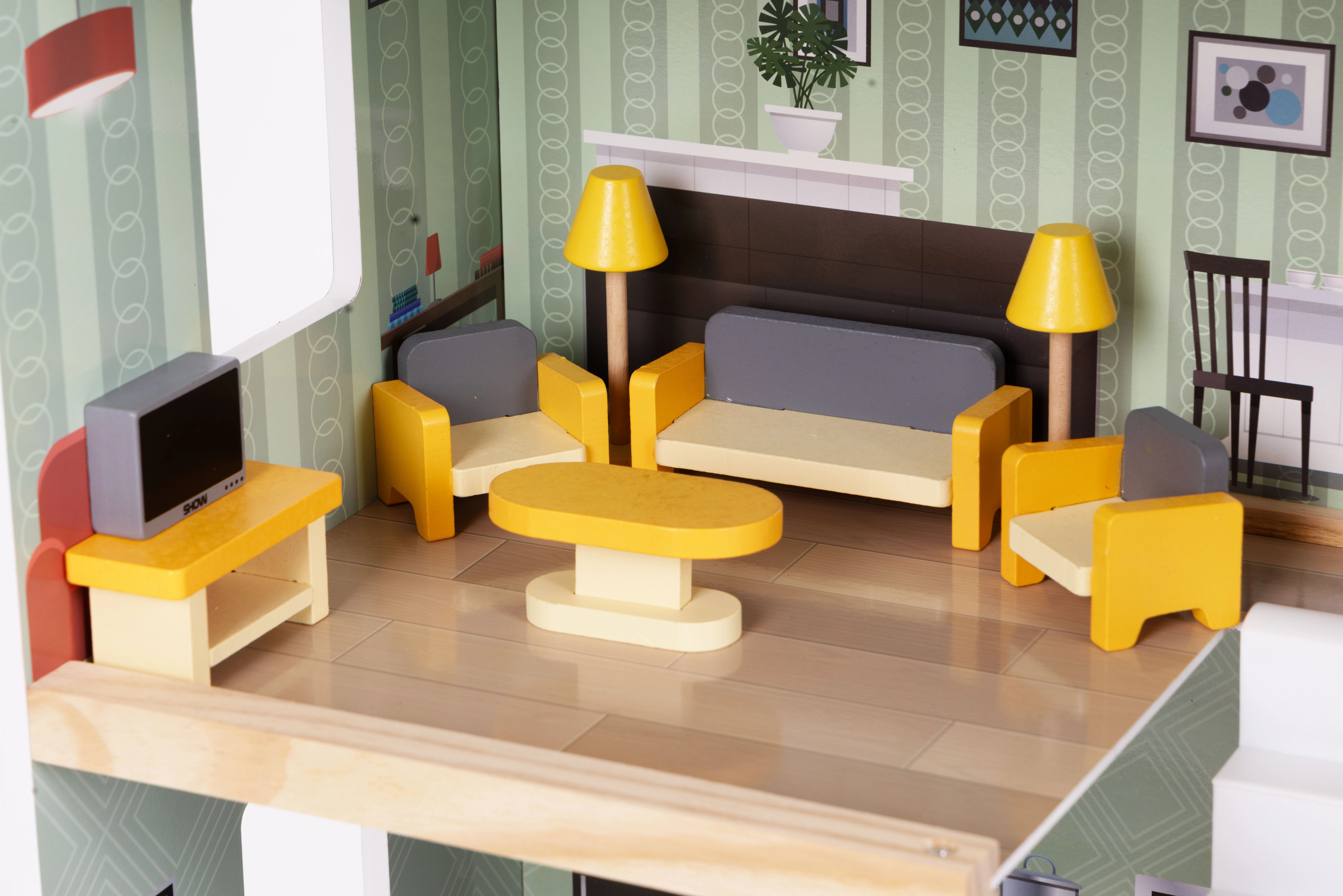 La pratica composizione per tutta la casetta include arredi per soggiorno, bagno, camera da letto, cucina e sala da pranzo. I pezzi sono adatti a bambole più piccole e si inseriscono anche in spazi ridotti – perfetti anche come set indipendente per il gioco libero.