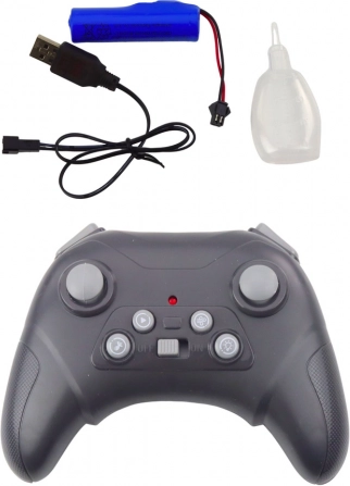 Radiocomando ergonomico 2,4 GHz con doppio joystick, batteria ricaricabile 3,7 V e cavo USB inclusi per un uso semplice.