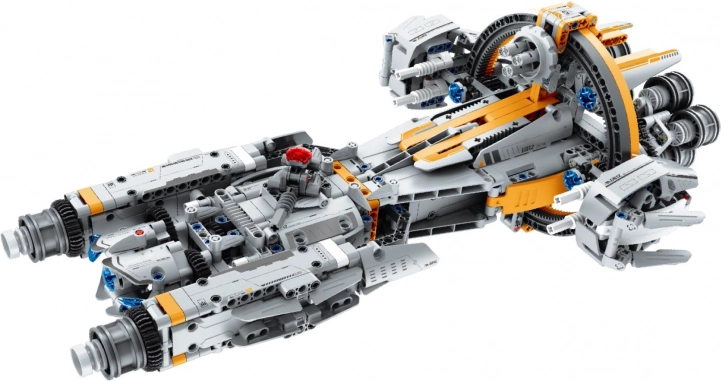 La parte posteriore del set è arricchita da un gruppo di motori con accenti arancioni e dettagli accurati per un effetto di volo dinamico.