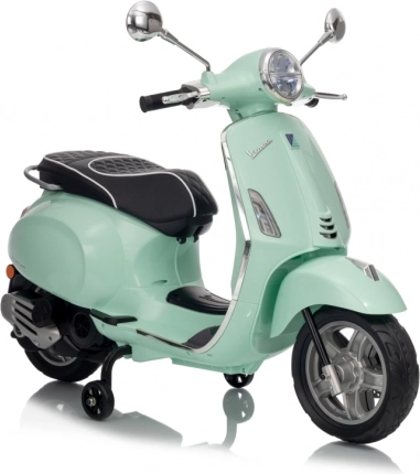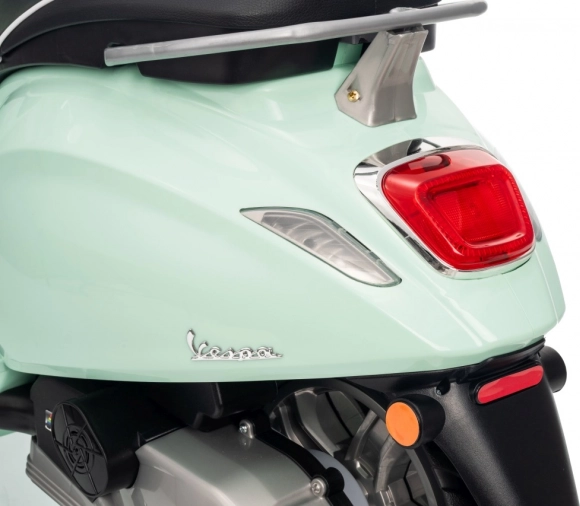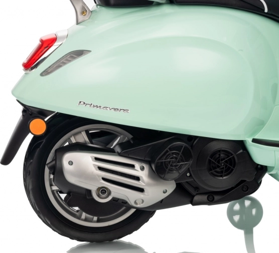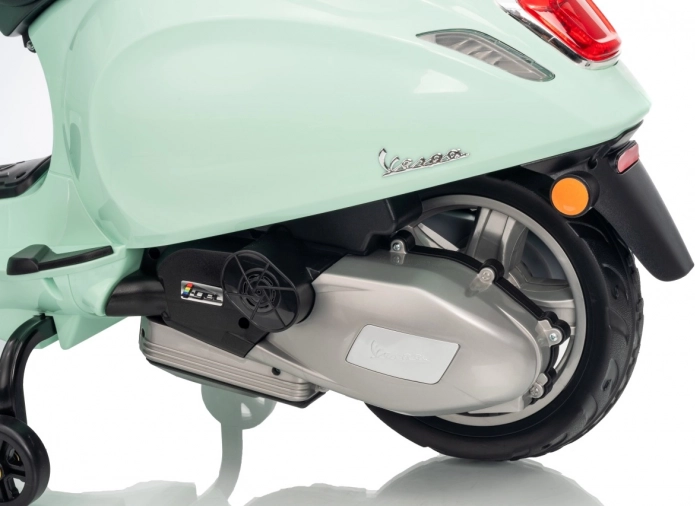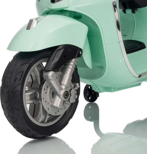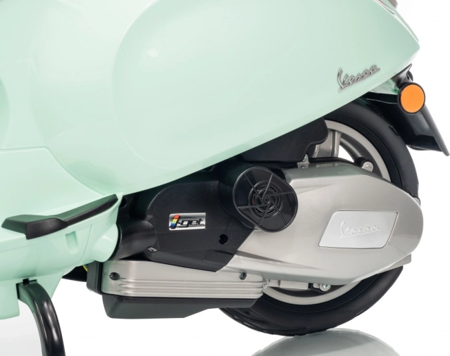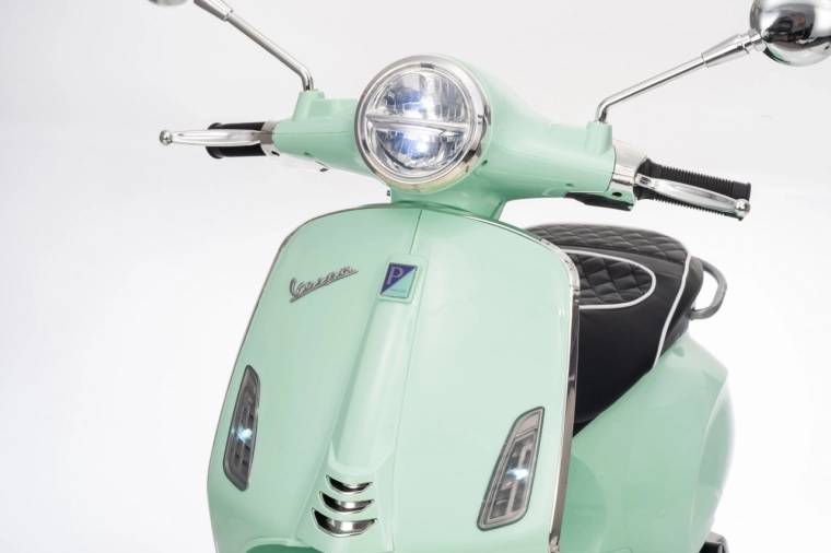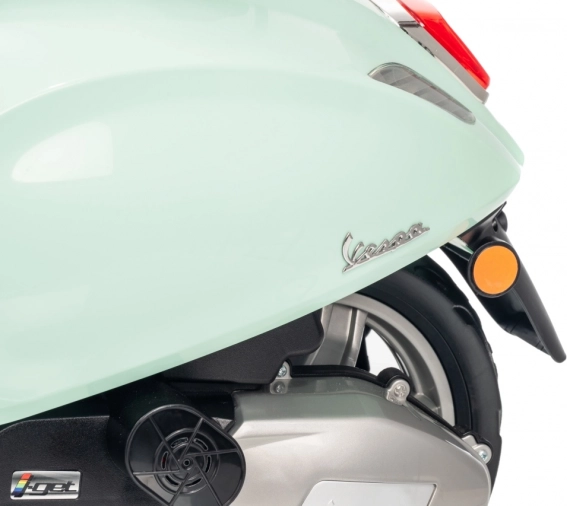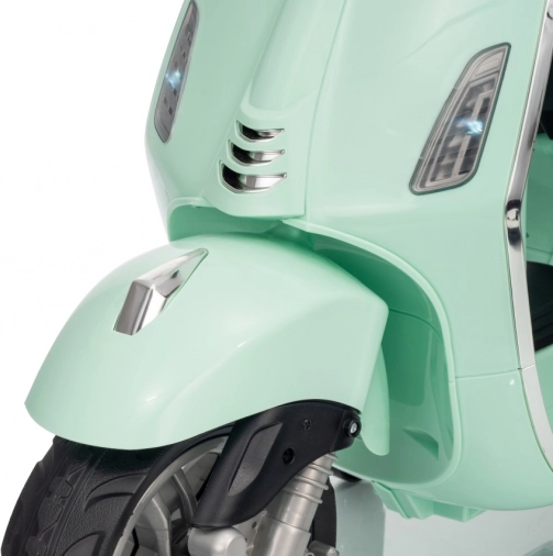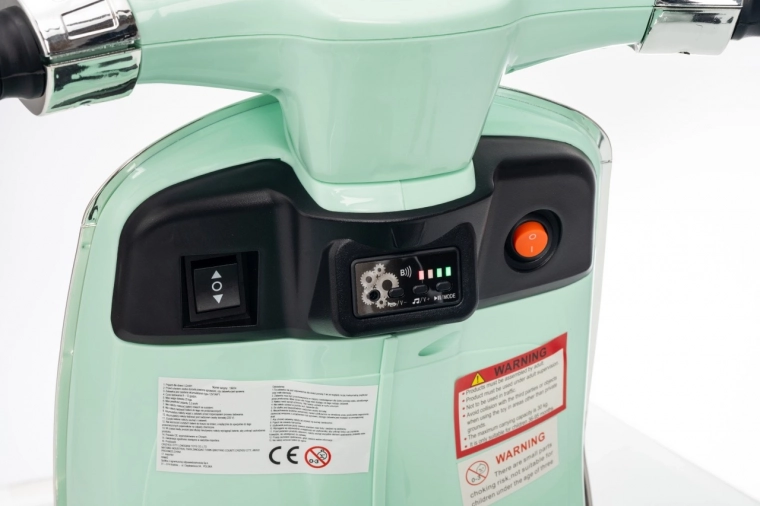 Il monopattino elettrico per bambini dal design alla moda VESPA Roma in colore verde menta entusiasma con il design realistico, due motori 2×35 W, una potente batteria 12 V 7 Ah e rotelle stabilizzatrici per una guida sicura. Il comfort è garantito dal sedile in eco-pelle, dalle silenziose ruote EVA e dalle luci LED anteriori e posteriori. Non mancano Bluetooth/MP3/AUX, suoni e clacson sul manubrio e indicatore di carica.
