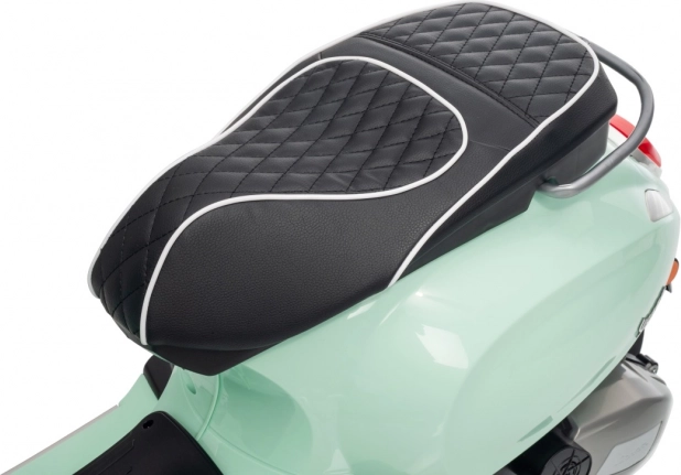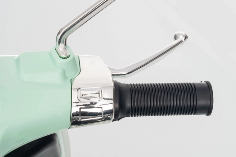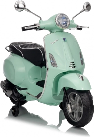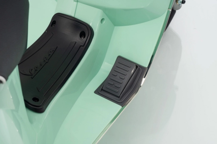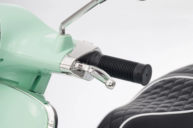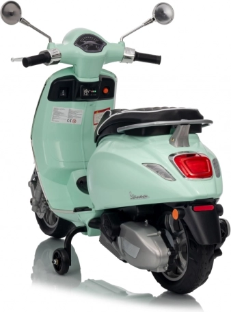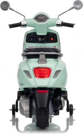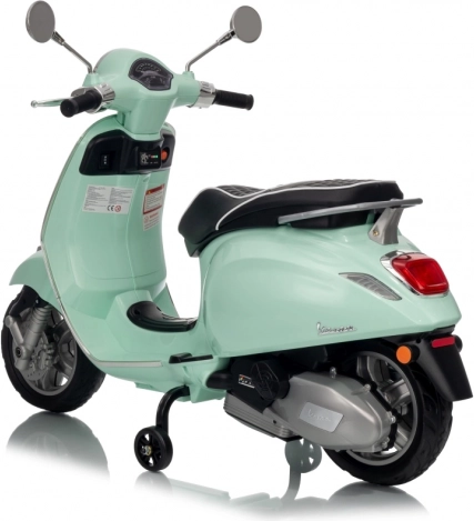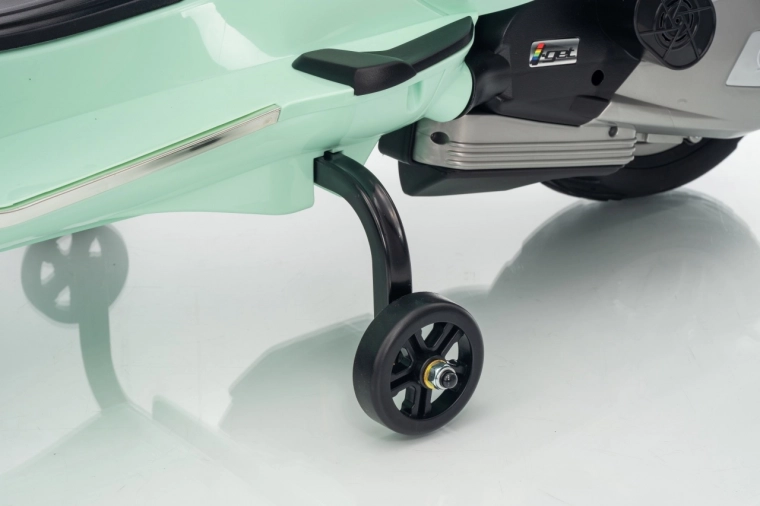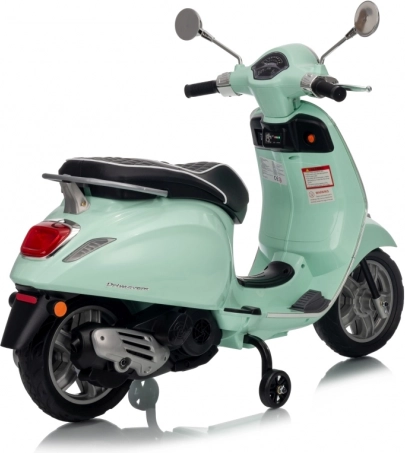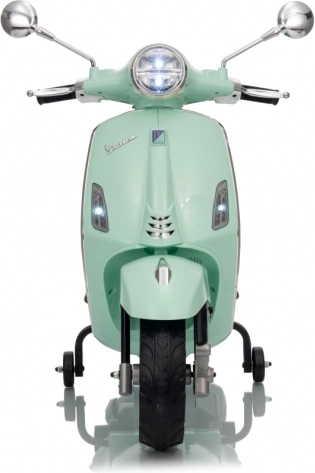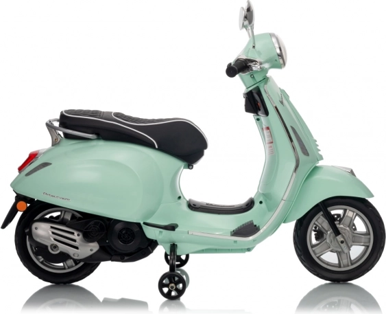 Il monopattino elettrico per bambini dal design alla moda VESPA Roma in colore verde menta entusiasma con il design realistico, due motori 2×35 W, una potente batteria 12 V 7 Ah e rotelle stabilizzatrici per una guida sicura. Il comfort è garantito dal sedile in eco-pelle, dalle silenziose ruote EVA e dalle luci LED anteriori e posteriori. Non mancano Bluetooth/MP3/AUX, suoni e clacson sul manubrio e indicatore di carica.