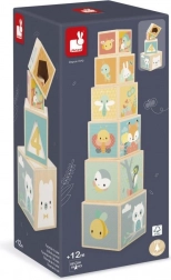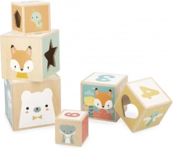 Cubi in legno lisci con simpatici animaletti e colori delicati che invitano al gioco e resistono all’uso quotidiano.