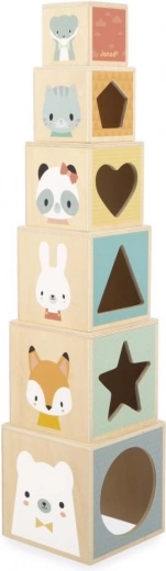 Questa piramide in legno con 6 cubi conquista con colori delicati e illustrazioni affettuose. I bambini possono impilare, ordinare e far passare i cubi, comprendendo meglio i principi di equilibrio, dimensione e spazio. Ogni cubo ha 5 lati diversi: un animaletto carino, l’animaletto nel suo ambiente, un piccolo animale su sfondo colorato, cifre per i primi calcoli e una sagoma traforata che, unendo due cubi, rivela un’illustrazione allegra (ad esempio un gattino in un cuore).