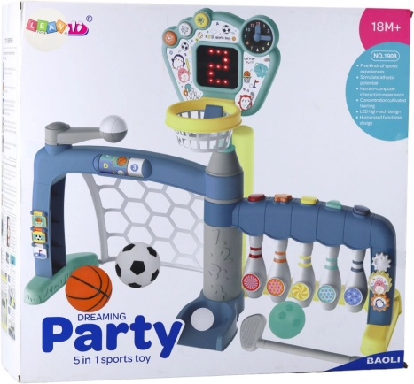 - porta con rete, canestro da basket, tabella con punteggio LED e suono, pallone da calcio, palla da basket, palla per bowling, pallina da golf, 5 birilli colorati, mazza da baseball, mazza da golf, orologio per imparare l’ora, 3 ingranaggi per esercizi della mano, manuale