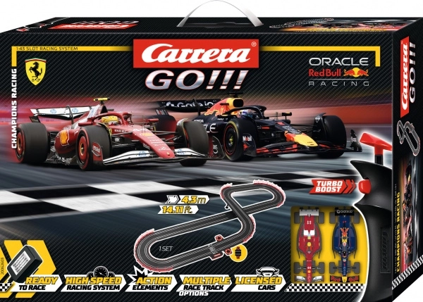 Vivi gare di F1 a casa con la pista CARRERA GO Champion's Racing lunga 4,3 m. Il set include le vetture FERRARI SF-25 di Lewis Hamilton e ORACLE RED BULL RACING RB21 di Max Verstappen, funzione Turbo sui controller, contagiri, ponte e montaggio semplice grazie alla pista rigida in scala 1:43. Divertimento ideale per bambini da 6 anni e appassionati adulti della velocità.