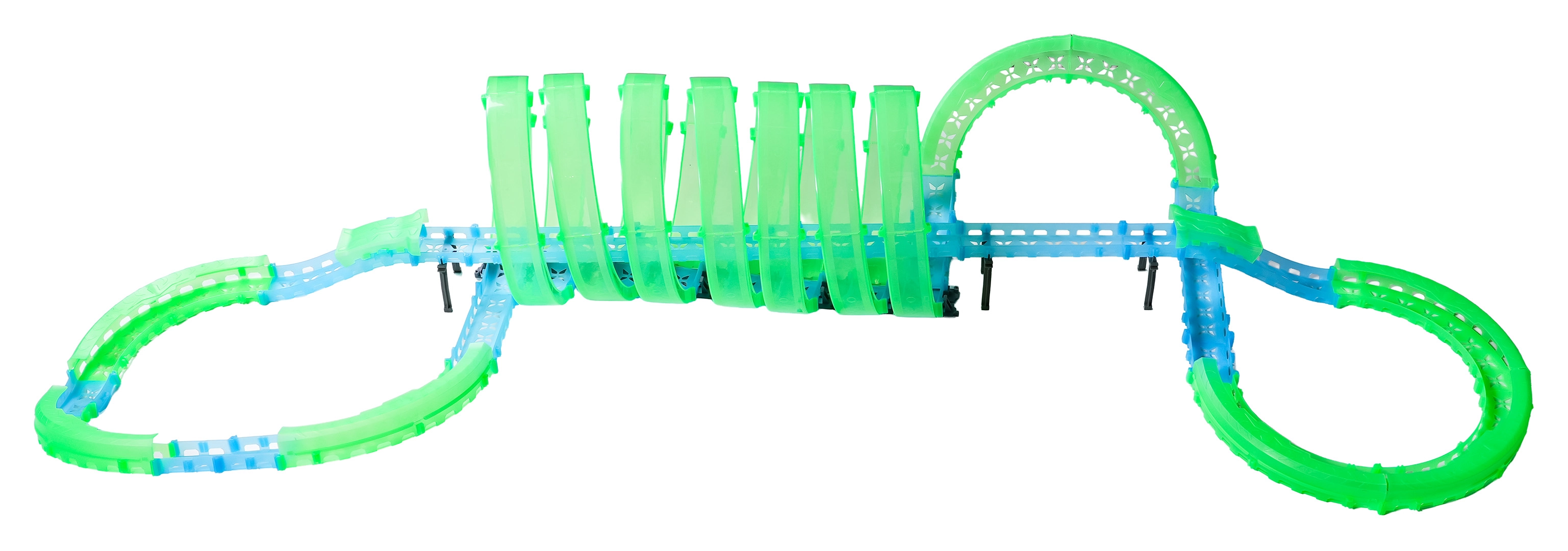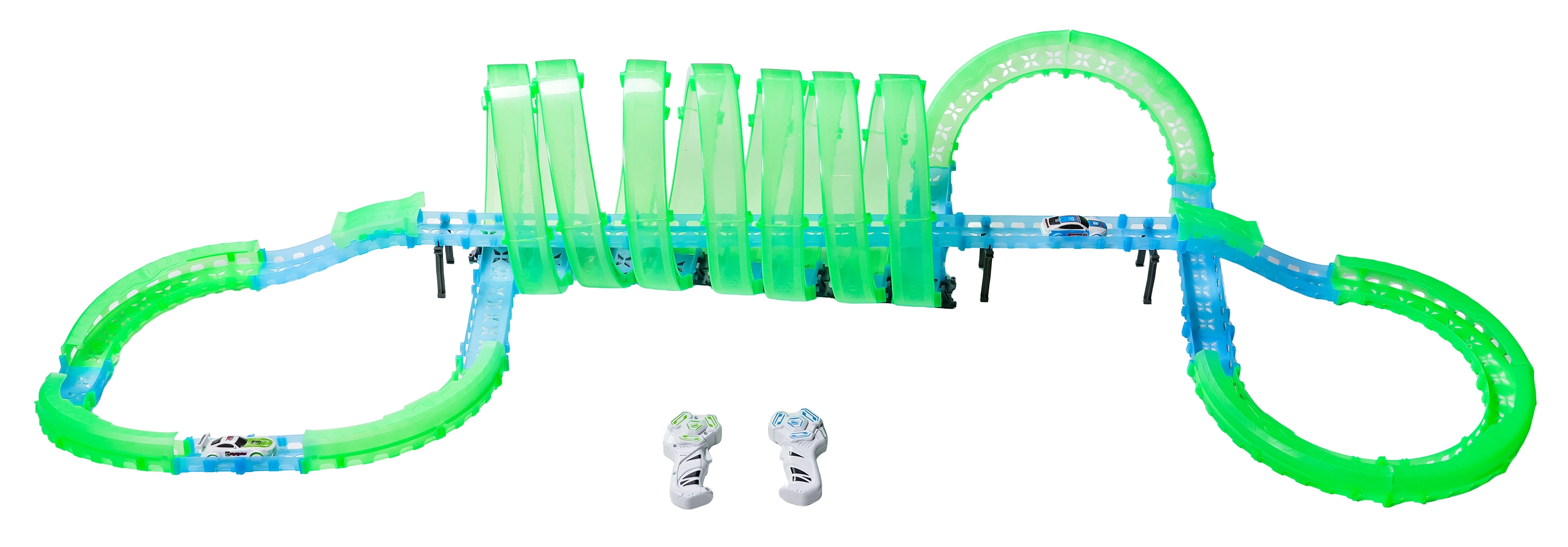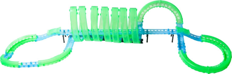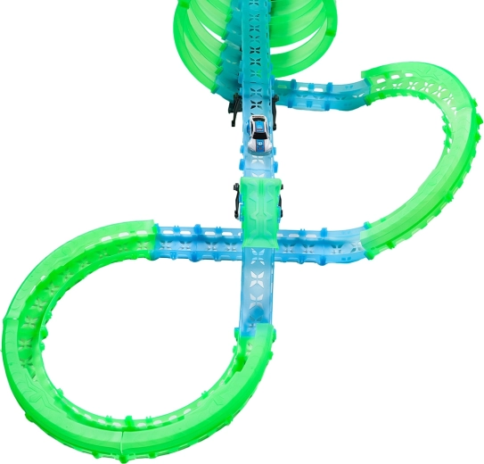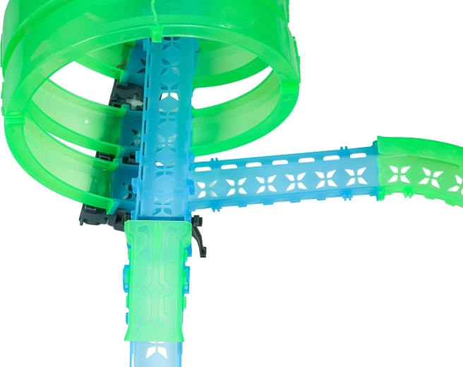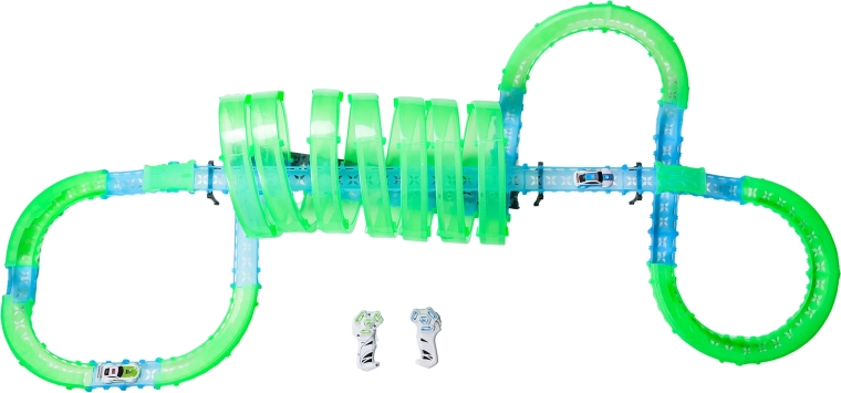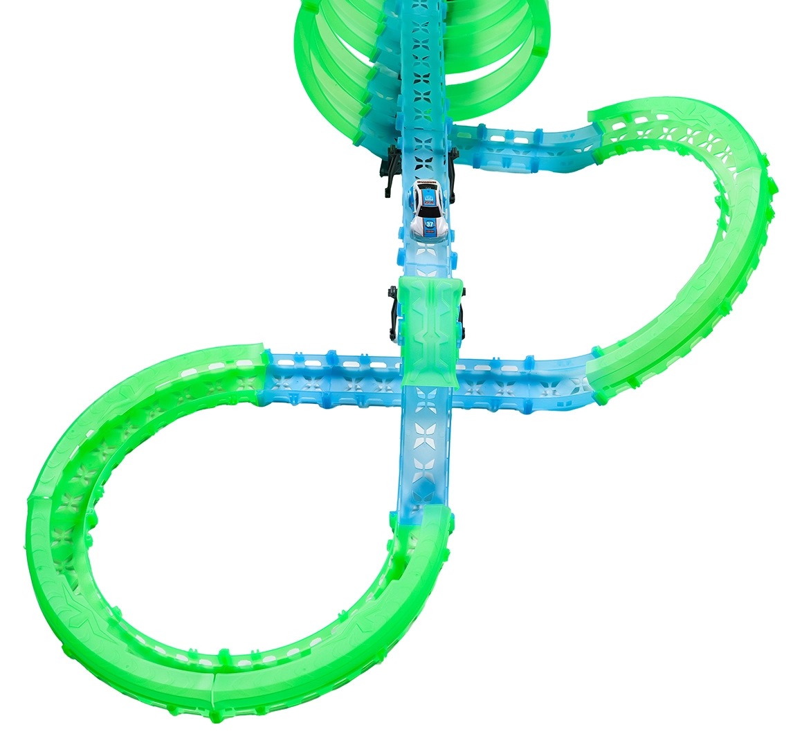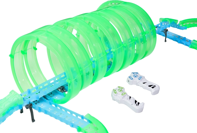 Questa pista modulare in pezzi traslucidi nelle tonalità neon verde e blu si assembla facilmente a scatto e consente rapide riconfigurazioni. Il materiale fluorescente si illumina dopo l’esposizione alla luce e, insieme alle macchinine LED, trasforma la stanza in un’affascinante arena luminosa.
