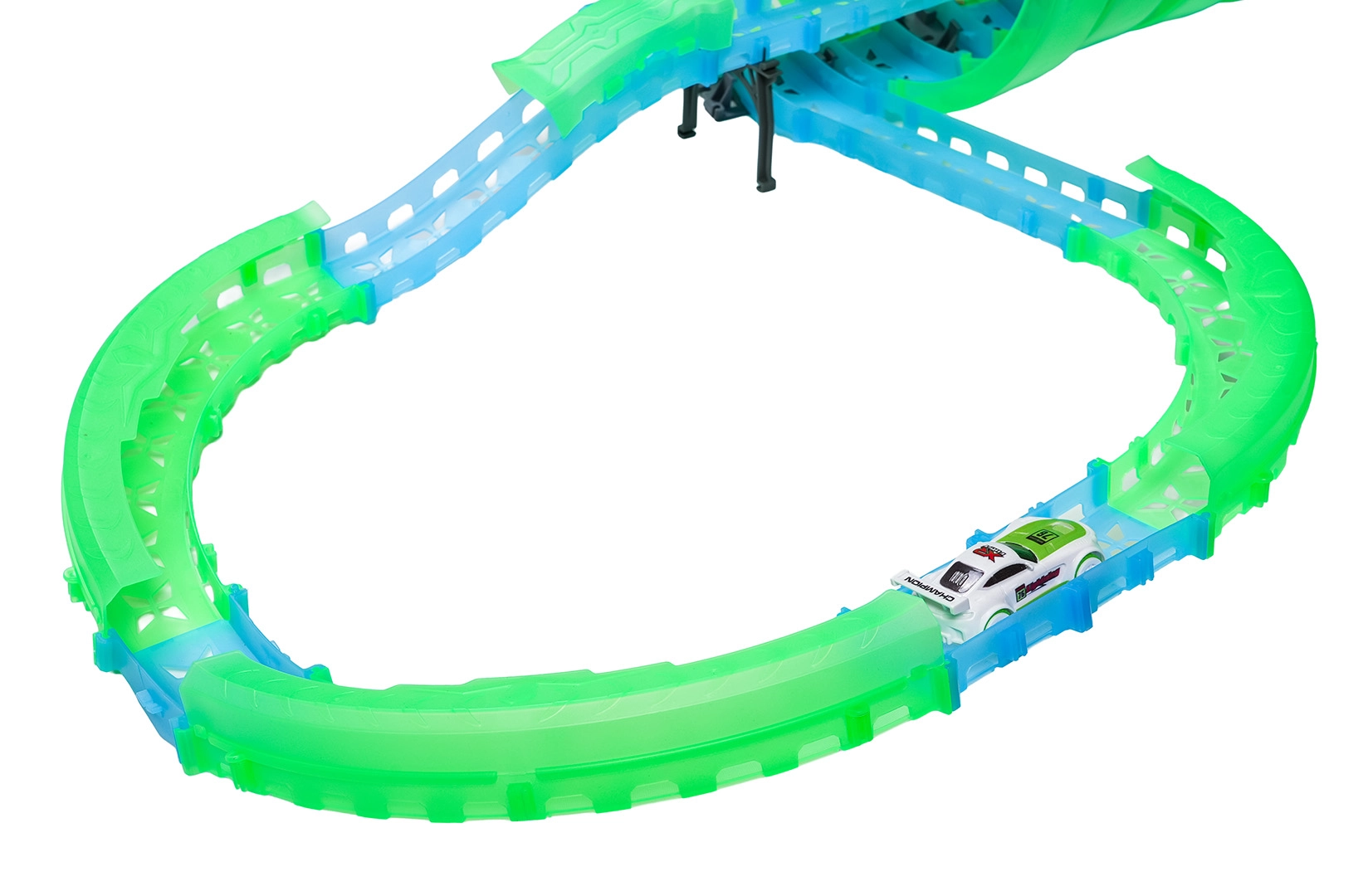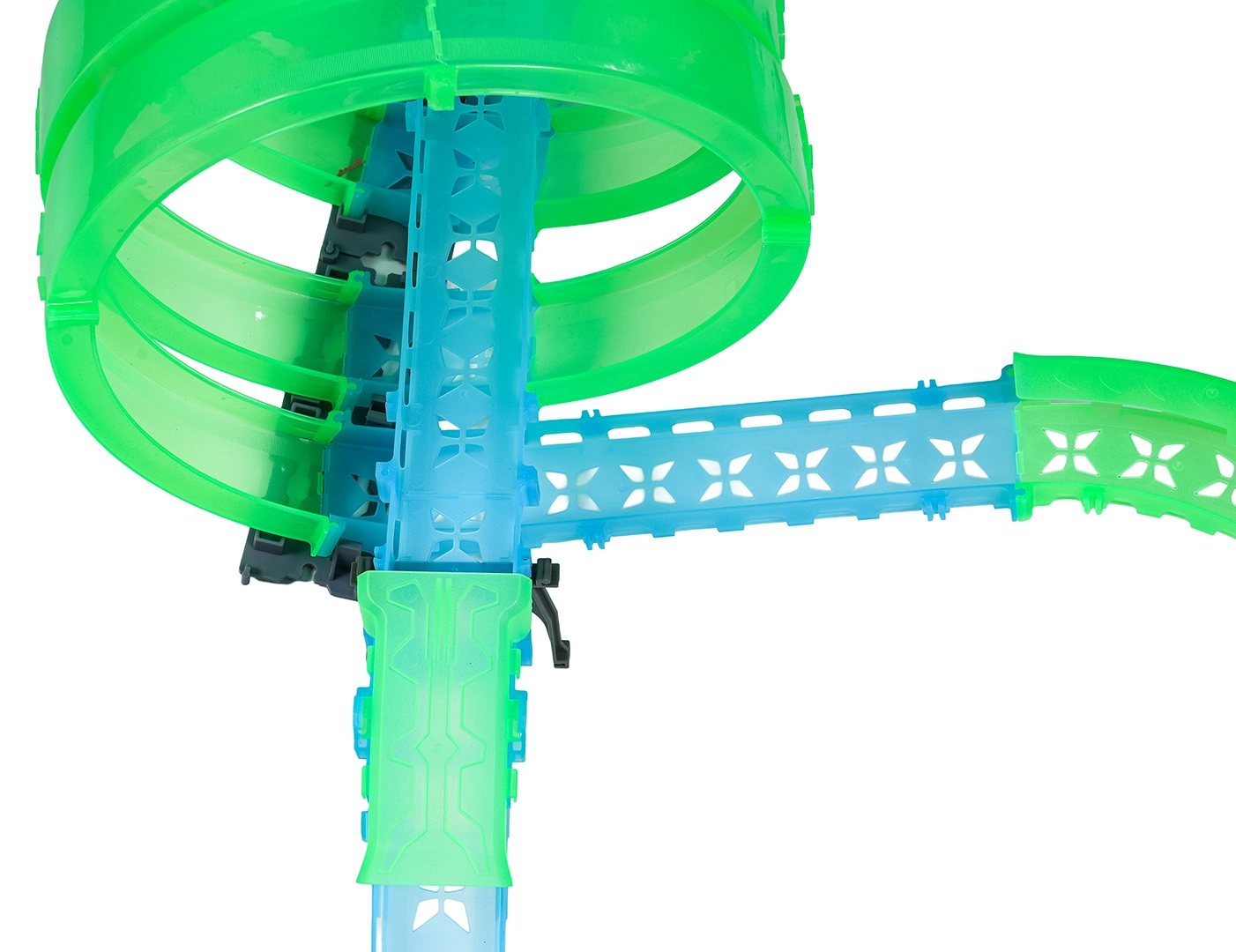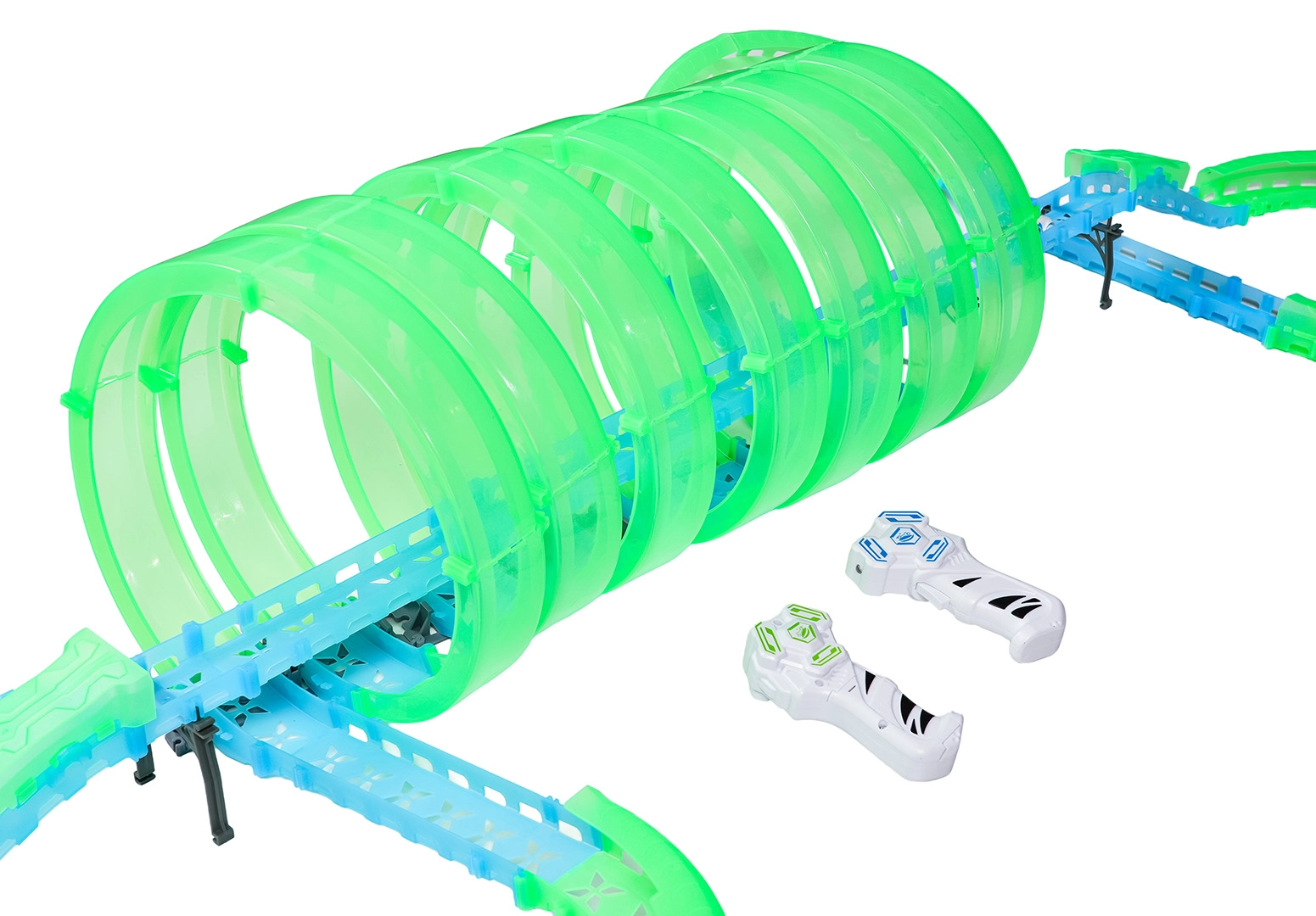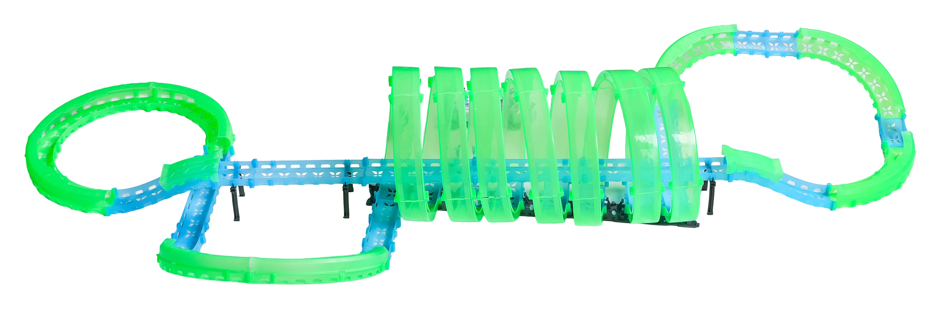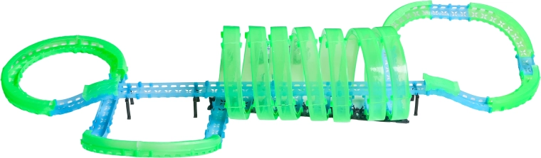 Questa pista modulare in pezzi traslucidi nelle tonalità neon verde e blu si assembla facilmente a scatto e consente rapide riconfigurazioni. Il materiale fluorescente si illumina dopo l’esposizione alla luce e, insieme alle macchinine LED, trasforma la stanza in un’affascinante arena luminosa.