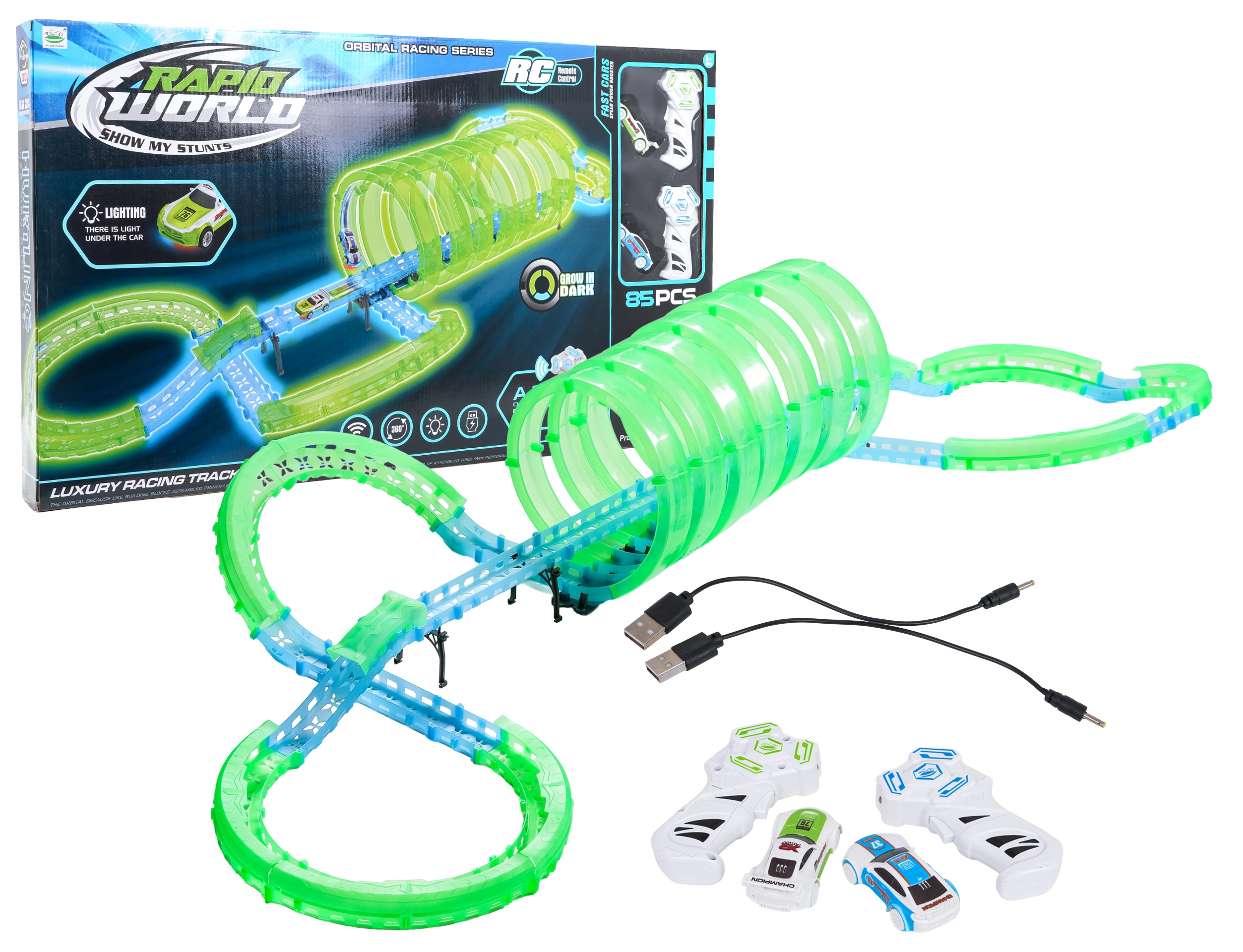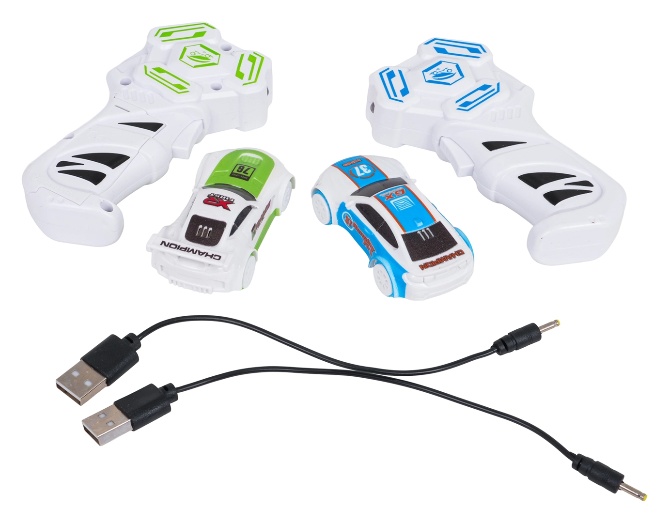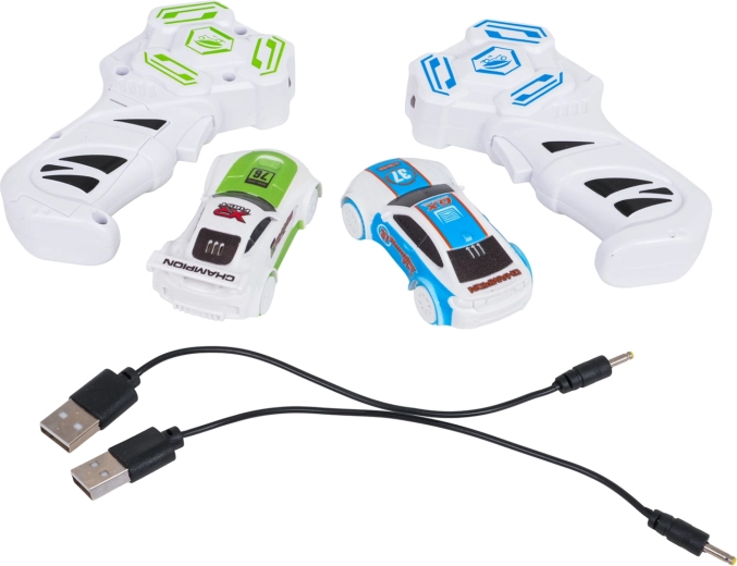 2 × macchinina, 2 × telecomando, 2 × cavo di ricarica USB, elementi della pista, manuale