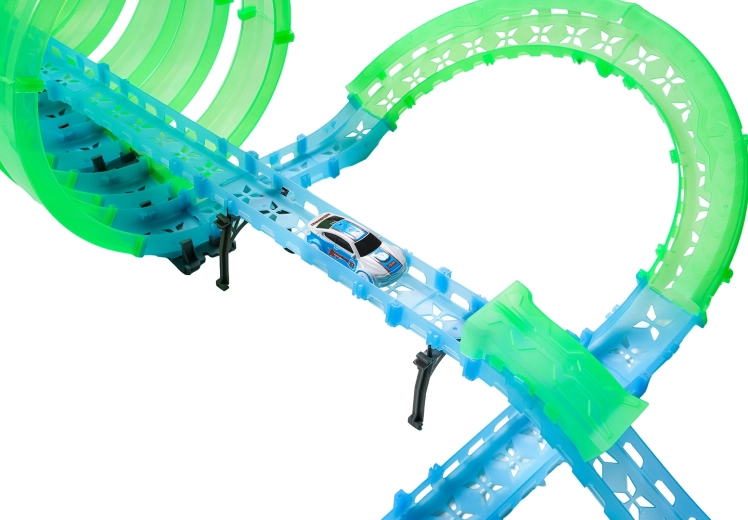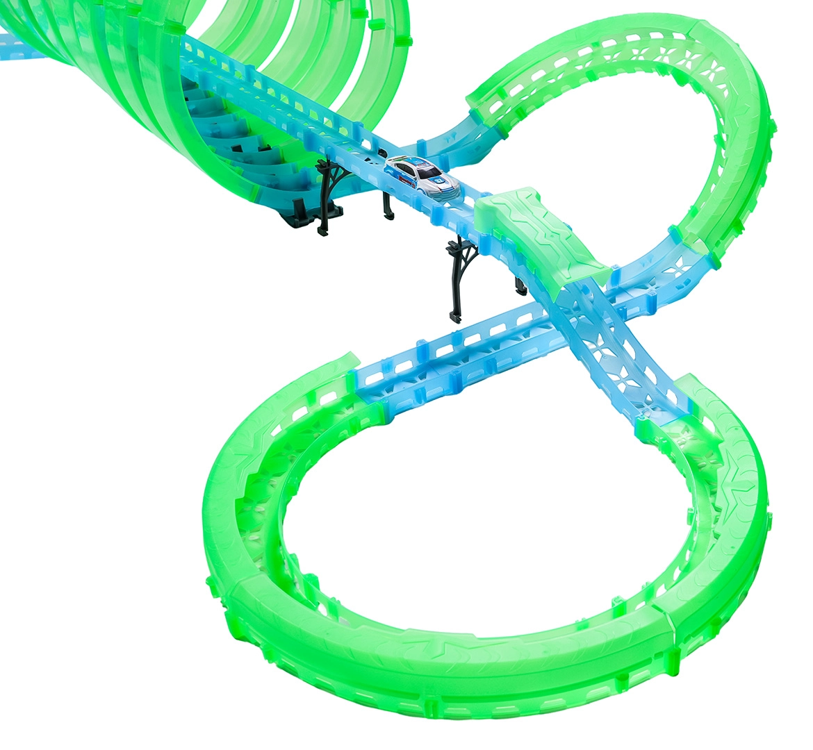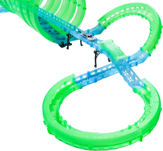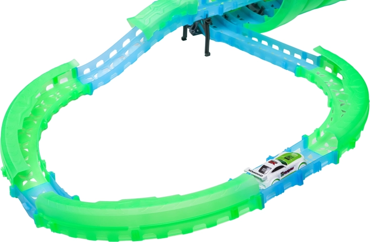 I pezzi fluorescenti della pista, dopo essere stati esposti alla luce, brillano, e l’illuminazione LED delle macchinine lascia una scia luminosa spettacolare durante la corsa.