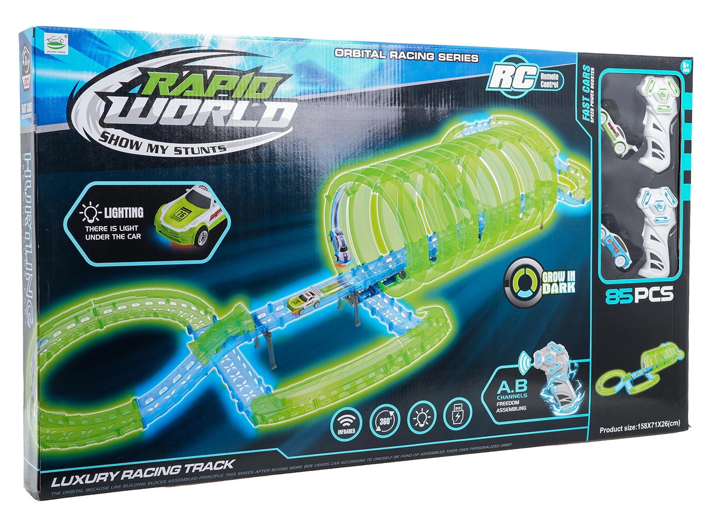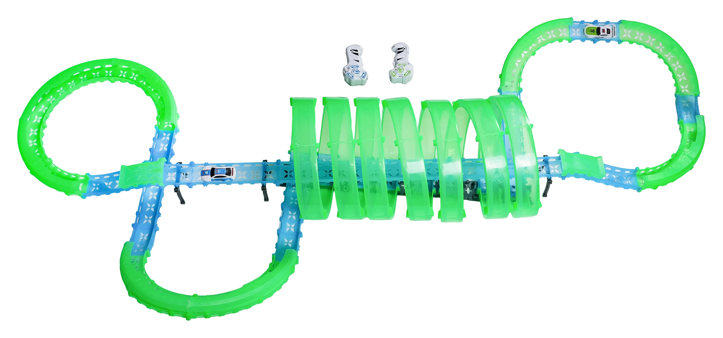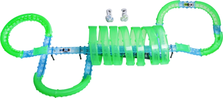 Inclusi due controller manuali per gare scattanti in due. La pista offre diversi loop a 360°, sezioni rialzate e tratti a tunnel per una guida dinamica e acrobazie.