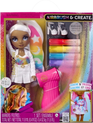 La bambola Rainbow High con outfit bianco e capelli bianchi è una tela perfetta per i piccoli stilisti. Con lo strumento airbrush e i pennarelli lavabili nei colori rosso, giallo, blu e viola, i bambini possono creare design unici dalla testa ai piedi. Al termine del divertimento, i colori si lavano facilmente e si può ricominciare da capo.