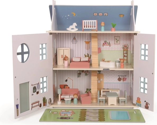 La casetta è realizzata in legno di qualità e completata da elementi in tessuto e feltro. Sono inclusi mobili e personaggi, così i bambini possono iniziare a giocare subito. I pannelli apribili facilitano l’accesso agli interni e le stampe dettagliate delle stanze favoriscono il gioco realistico. La struttura robusta garantisce lunga durata e un uso sicuro.