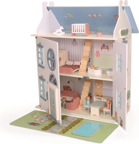 Scoprite la magica casetta delle bambole in legno con tre piani, porte frontali apribili e ricchi accessori. Grazie ai dettagli ben studiati, come il tetto removibile che si trasforma in un giardino con piscina, offrirà ai bambini ore di gioco creativo. La casetta favorisce la motricità fine, le abilità comunicative e le interazioni sociali, diventando anche una decorazione di stile per ogni cameretta.