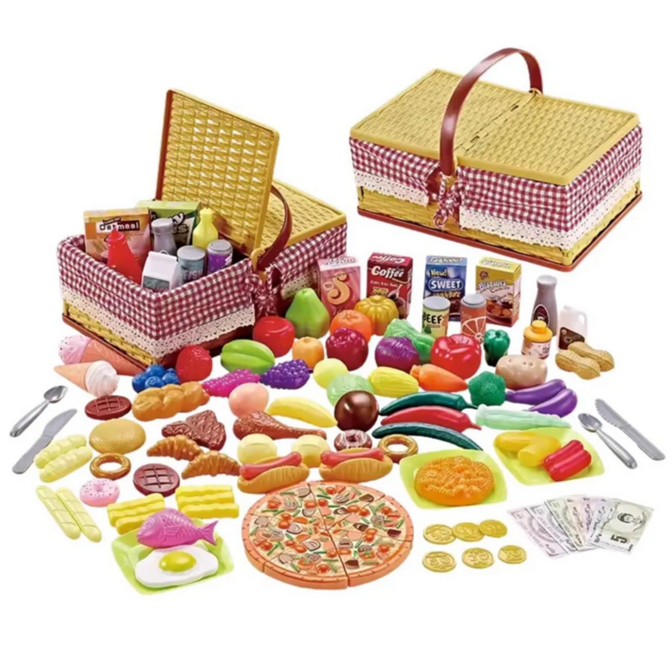 Nella confezione trovi una vasta selezione di alimenti e accessori: dalla pizza tagliata a spicchi a frutta e verdura, fino a dessert, bevande e posate. Non mancano banconote e monete per il gioco del negozio, che sviluppa pensiero logico e calcolo.