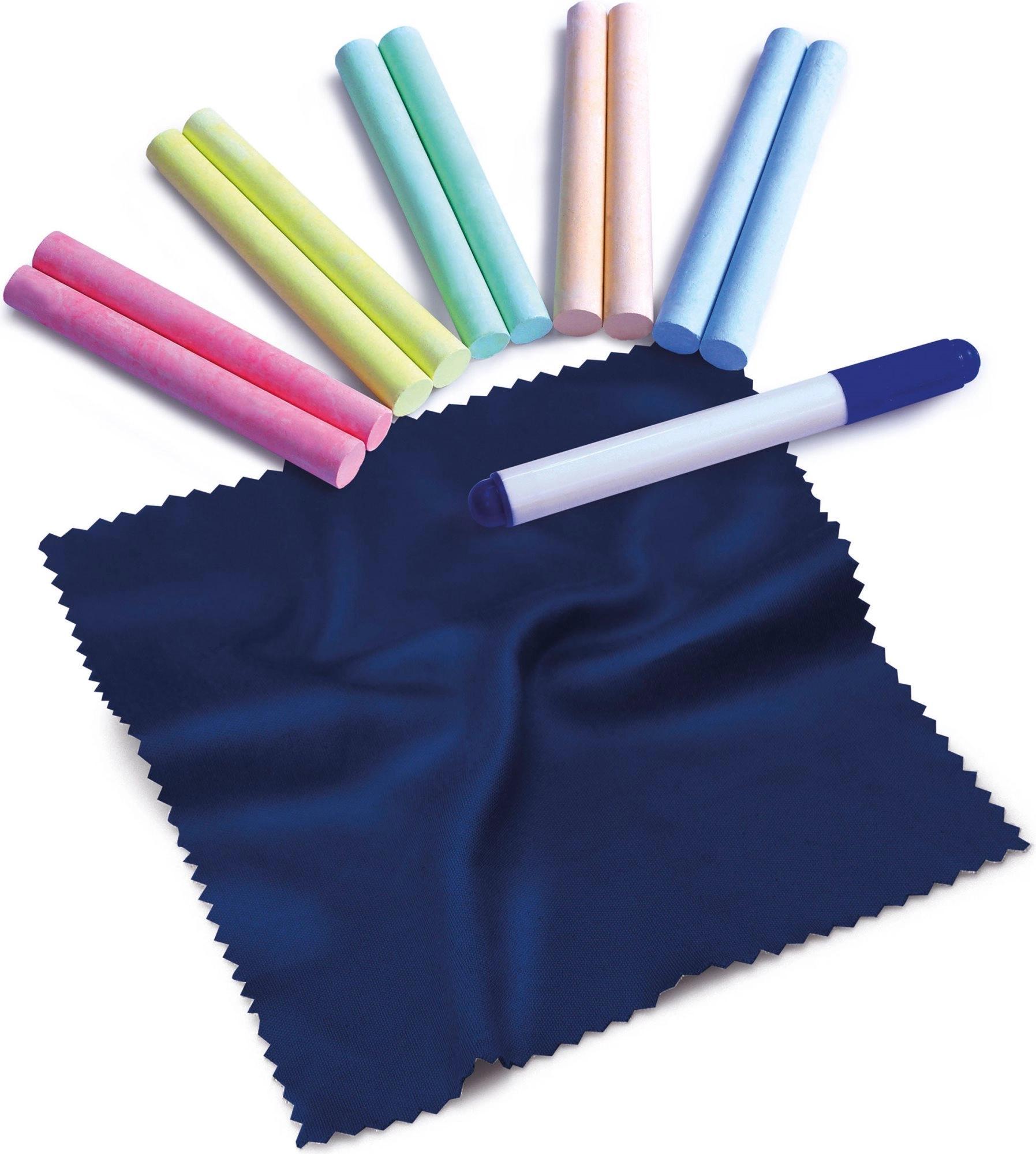 Scatolina con 10 gessetti, 1 pennarello nero cancellabile, panno per cancellare