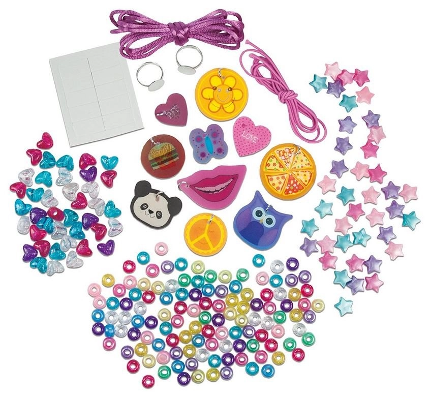 200 perline (120 rotonde, 40 cuoricini, 40 stelline), 10 ciondoli, cordino, elastico, 2 anellini, quadratini adesivi
