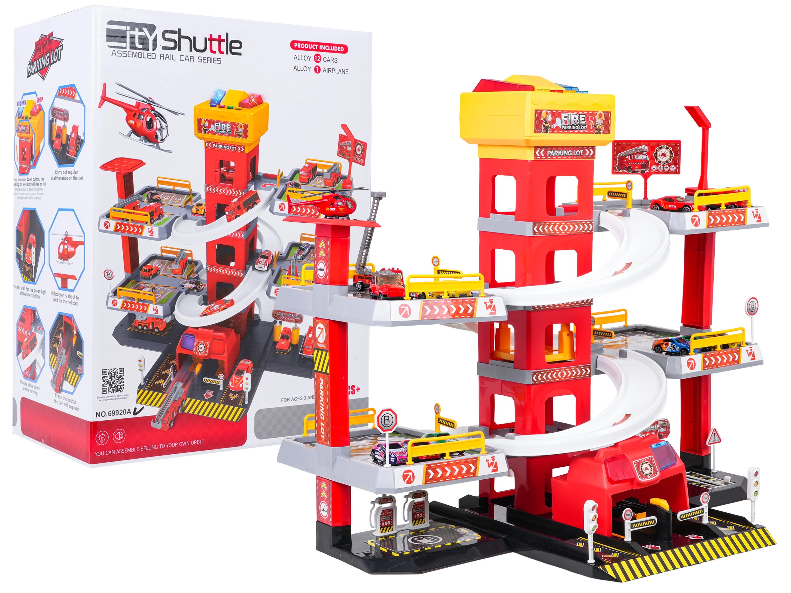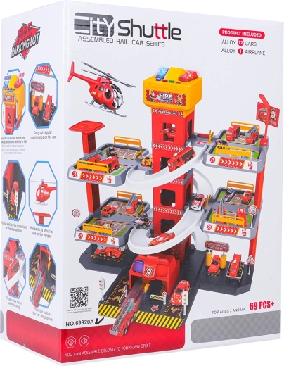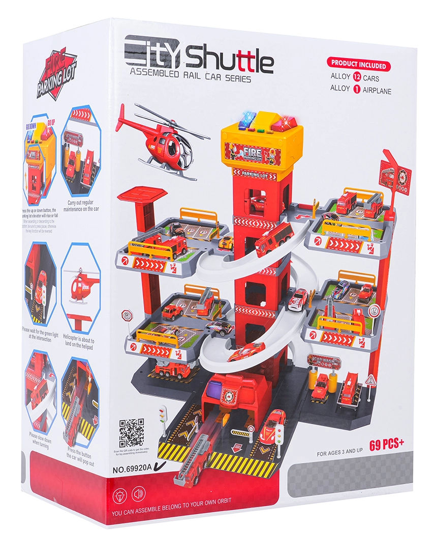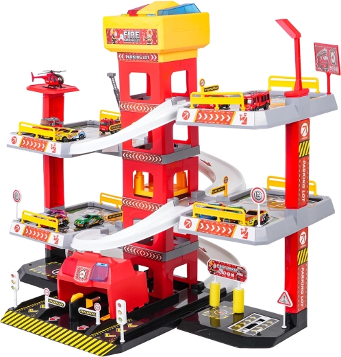 Questo grande parcheggio dei pompieri a 3 piani offre ai bambini un gioco realistico e dinamico. Grazie alla torre centrale con ascensore, le macchinine possono spostarsi comodamente tra i piani o sfrecciare giù lungo le rampe curve. Il pannello superiore dell’ascensore è dotato di grandi pulsanti per il controllo su/giù e di quattro pulsanti più piccoli per gli effetti: suoni di avviamento, retromarcia, accelerazione, frenata e melodia, il tutto accompagnato da luci lampeggianti.
