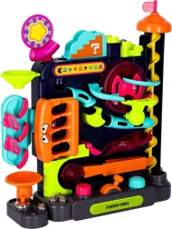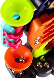 Le leve, i pulsanti e i meccanismi rotanti permettono ai bambini di guidare attivamente il percorso delle biglie, sviluppando la motricità fine e la precisione dei movimenti.