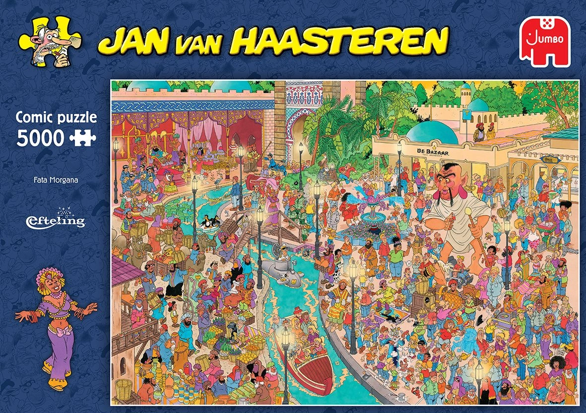 Scopri un mondo pieno di umorismo e dettagli con i leggendari puzzle di JAN VAN HAASTEREN. Il puzzle di grande formato da 5000 pezzi presenta la scena Fata Morgana a Efteling, ricca di gag, personaggi e elementi iconici come la pinna di squalo e le mani fuori posto. L’eccellente qualità JUMBO garantisce pezzi precisi e ore di divertimento.