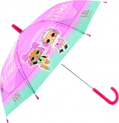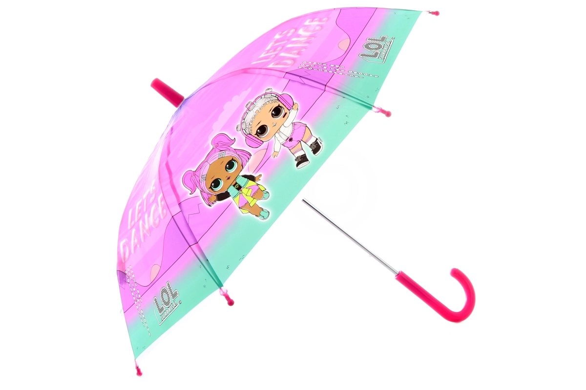 Allegro ombrello per bambini con motivi LOL Surprise protegge i piccoli avventurieri dalla pioggia. Dispone di apertura manuale, struttura resistente con stecche in metallo e comoda impugnatura a J. La stampa colorata con il testo “LET’S DANCE” e il design rosa–menta lo rendono un accessorio elegante per bambini dai 3 anni in su.